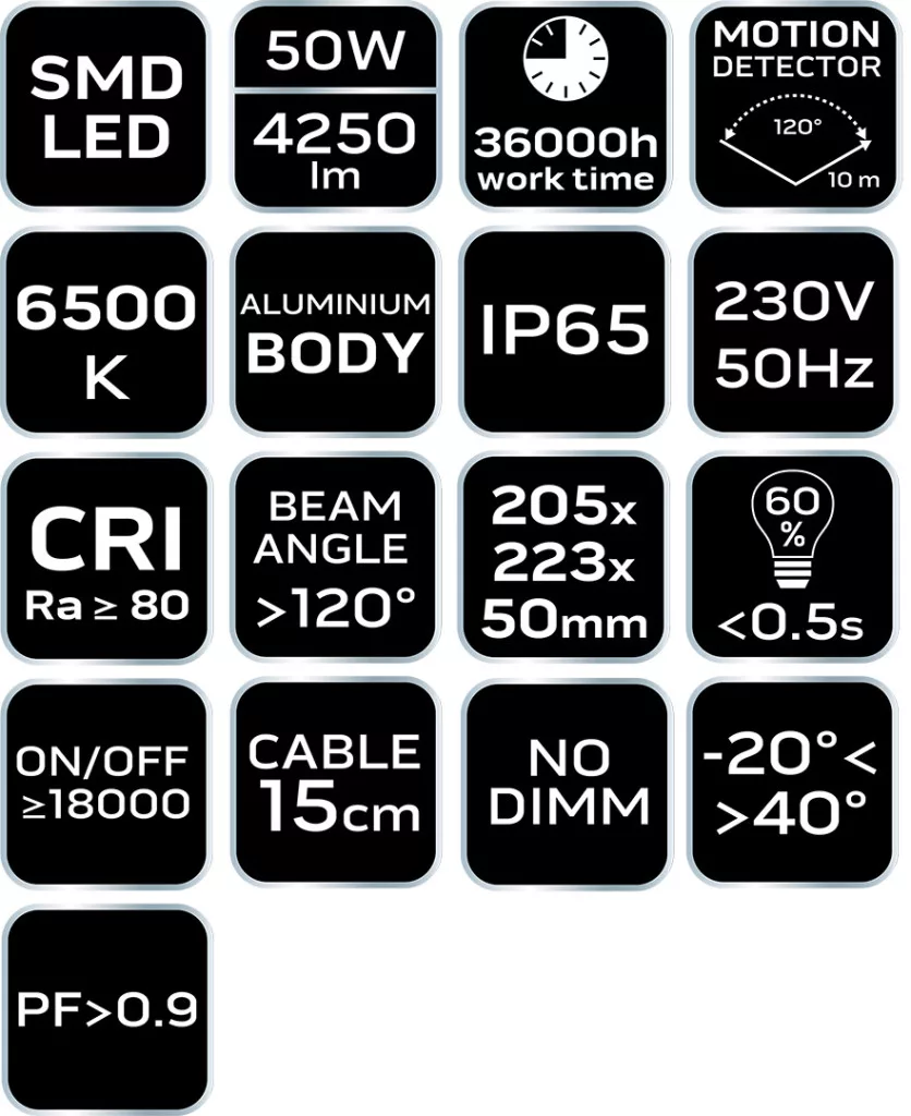 Ez a NEO mozgásérzékelős reflektor ideális választás lehet az otthon, kert, vagy egyéb kültéri területek hatékony és energiatakarékos megvilágításához. A mozgásérzékelő technológia és az állítható üzemidő és érzékenység növelik a lámpa intelligens funkcióit. Erős és Hatékony Megvilágítás: A 50 W-os SMD LED-ek 4000 lumen fényárammal biztosítanak erős és hatékony megvilágítást, ideális kültéri területekhez. Alumíniumból Készült Lámpatest: Az alumínium lámpatest tartós és időjárásálló kivitelt biztosít. IP65 Védelmi Szint: Az IP65 védelmi szint lehetővé teszi a reflektor kültéri használatát, ellenállva a pornak és a vízsugaraknak.Mozgásérzékelő Technológia: A mozgásérzékelő 120 fokos befogási szöggel és akár 10 m-es hatótávolsággal észleli a mozgást, automatikusan bekapcsolva a fényt. Állítható Üzemidő: A reflektornak állítható az üzemideje, lehetővé téve a fény szabályozását az igényeknek megfelelően. Mozgás- és Szürkületérzékelő Érzékenység: Beállíthatja a mozgás- és szürkületérzékelő érzékenységét, szabályozva, hogy mikor aktiválódjon a lámpa. CE Tanúsítvány: Az európai biztonsági előírásoknak való megfelelést a CE tanúsítvány igazolja, garantálva a termék minőségét és biztonságát. Fedezze fel a NEO reflektor előnyeit, és élvezze a kényelmes és megbízható világítást a kültéren!