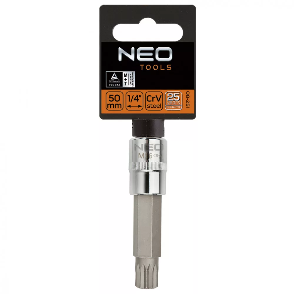 A NEO 1/2"-os Spline dugókulcs króm-vanádium acélból készül, 100mm HOSSZÚ, DIN 3124 . A dugókulcs szferikus kialakítása igen széles alkalmazási lehetőségeket biztosít, lehetővé téve a Torx, a Spline, a 12-lapú, a metrikus, a colos és a négylapú csavarok kicsavarását is. A szerszám minőségét bizonyítja a TÜV tanúsítvány és a 25 éves gyártói garancia. A NEO márka a professzionális igényeket is kielégíti.