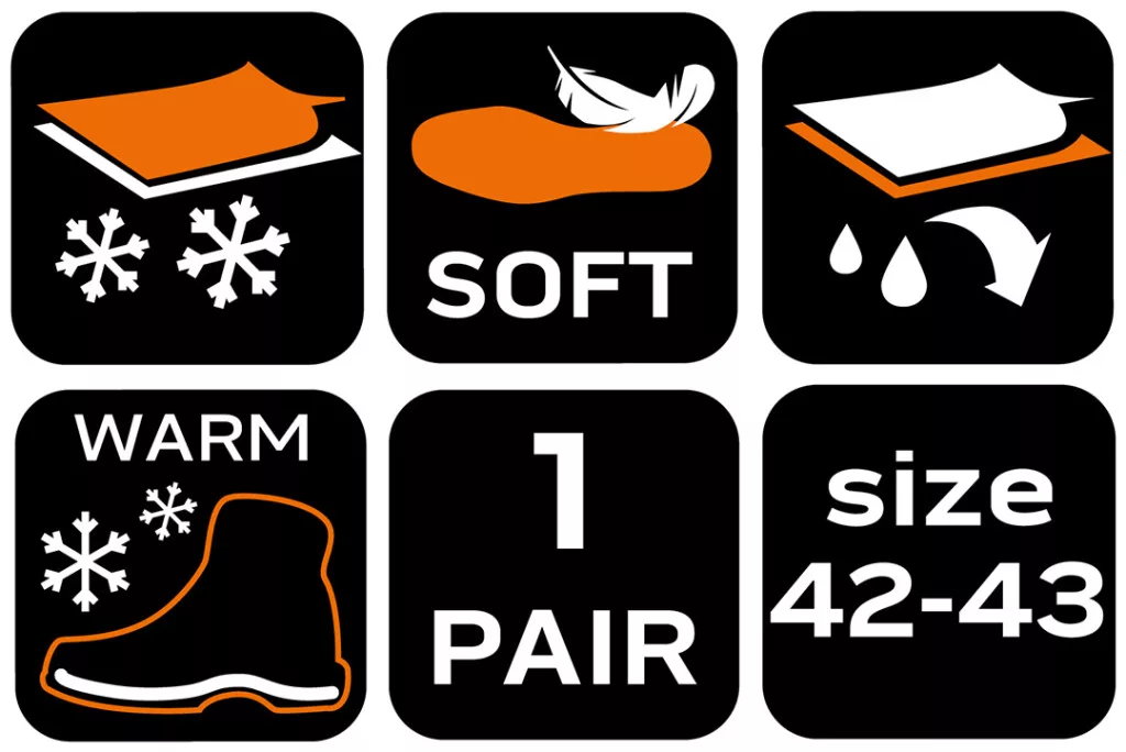 NEO 82-347 Talpbetét, hőszigetelt, nedvszívó anyag.Termo-komfor talpbetétje filcből készült, alumíniumfóliával ellátott, praktikus betét, amely védi a lábat a hidegtől és a nedvességtől. A talpbetétek enyhítik a láb talajra gyakorolt nyomását és csökkentik a láb túlzott fáradtságát. Alkalmasak munka- és egyéb cipőkhöz, valamint mindennapi viselethez egyaránt.