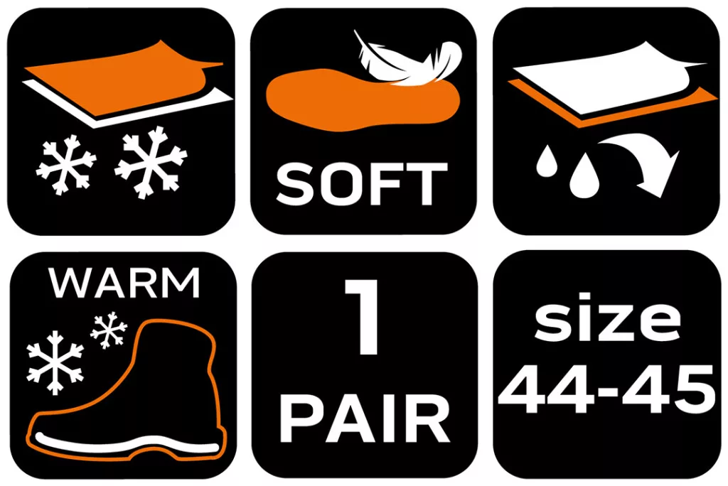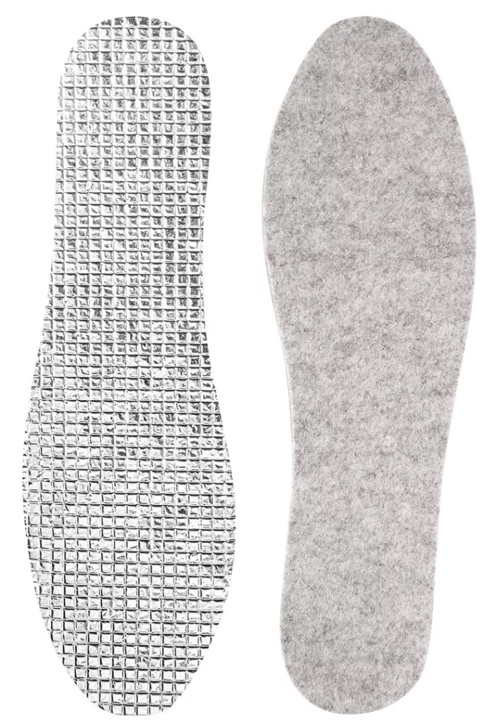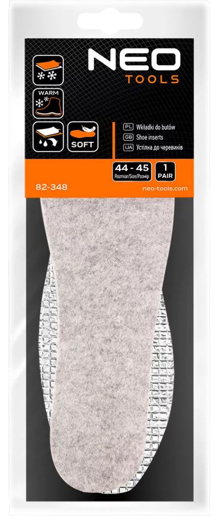 NEO 82-348 Talpbetét, hőszigetelt, nedvszívó anyag.Termo-komfor talpbetétje filcből készült, alumíniumfóliával ellátott, praktikus betét, amely védi a lábat a hidegtől és a nedvességtől. A talpbetétek enyhítik a láb talajra gyakorolt nyomását és csökkentik a láb túlzott fáradtságát. Alkalmasak munka- és egyéb cipőkhöz, valamint mindennapi viselethez egyaránt.