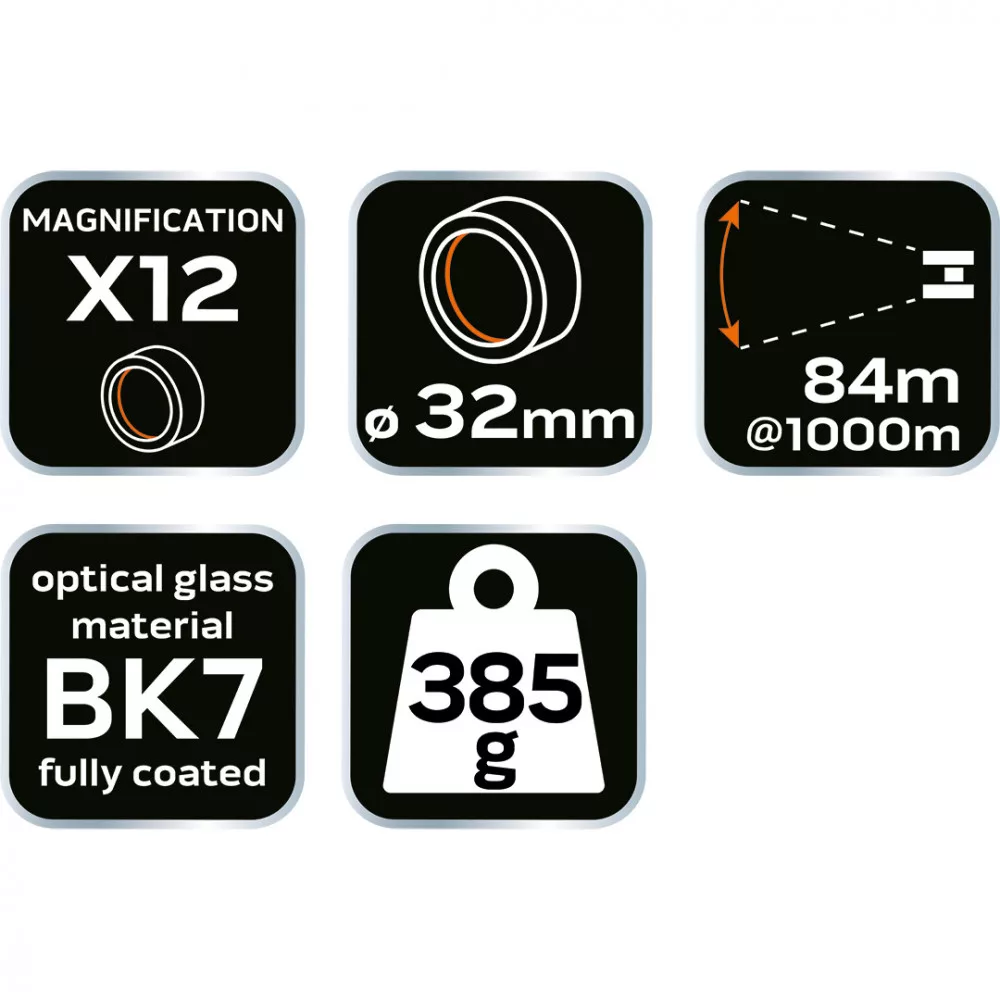A NEO TOOLS 12 x 32, 63-166 nagy binokulár egy kicsi és praktikus műanyag eszköz, amelynek méretei 135 x 83-115 x 46 mm. 12x-es nagyítással és 32 mm-es lencseátmérővel rendelkezik. Fókuszáló csavarral és BK7 prizmával rendelkezik. A látómező 84 m /1000 m. Ez egy összecsukható és könnyen hordozható NEO TOOLS binokulár, melynek súlya 385 g. Egy nyakpánttal és egy hordtáskával együtt kínáljuk. Ezt a távcsövet tájmegfigyelésre ajánljuk.