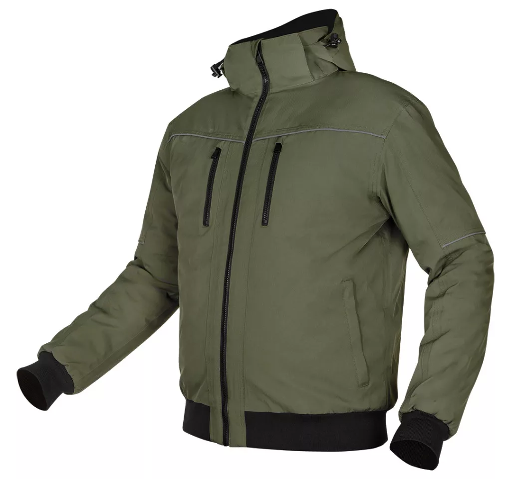 NEO 81-579 Téli munkavédelmi kabát, OUTDOOR, hőszigetelt, kapucnis, zöld. "Bomber" típusú szigetelt kabát, amely 100% poliészter összetételű, mini halszálkás elasztomultészter anyagból készült. A főszövet 190 g/m2 és a bélés 180 g/m2 tömegű. A NEO TOOLS kabát mellkasi és oldalsó cipzáras zsebekkel rendelkezik. Elől és hátul fekete színű fényvisszaverő csíkkal van ellátva. Az ujjakon lévő fényvisszaverő csík, valamint a kabát ujjain és alján lévő bordázat szintén fekete színű. A beépített, állítható kapucni jól véd a szél és a hideg ellen. A kabát nyakán nyomtatott logó és névtábla található a jobb személyre szabhatóság érdekében a munkahelyen.