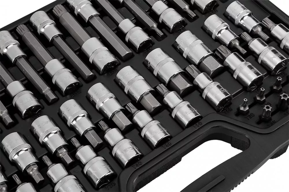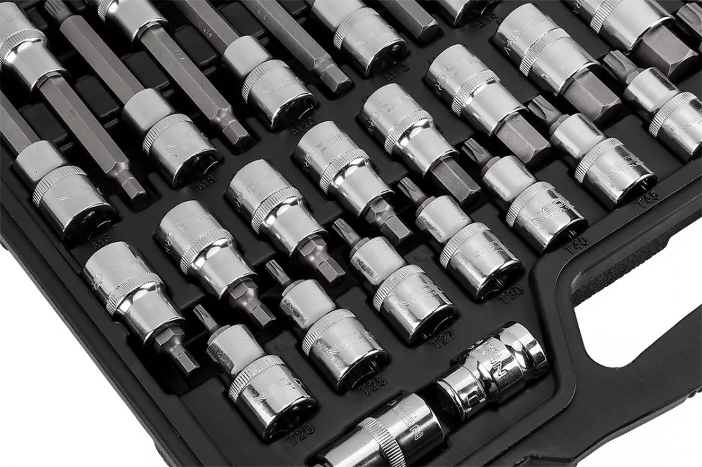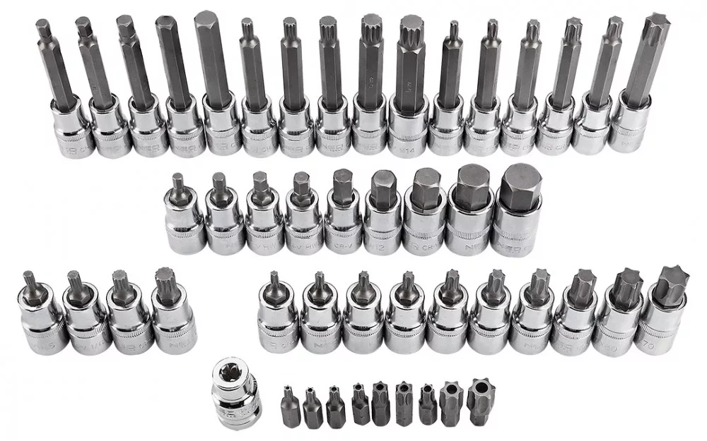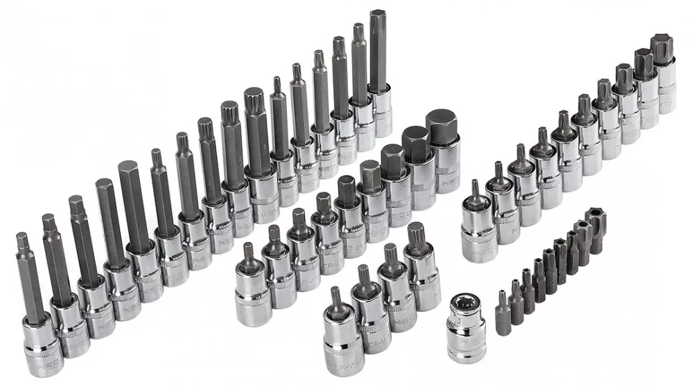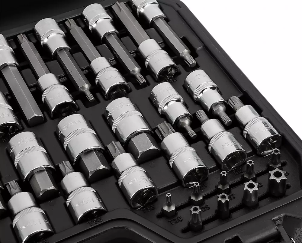 NEO Torx bitkészlet. A 49 elemből álló készlet bitek és dugóbitek széles választékát tartalmazza, ezen belül hosszú dugóbiteket H6 és H12, valamint T25 és T60 közötti méretekben, rövid dugóbiteket H5 és H19 közötti méretekben, valamint 1/4"-os furatos Torx biteket T20 és T60 közötti méretekben. A készlet minden eleme kiváló minőségű acélból készül, a kulcsadapterek króm-vanádium acélból, míg maguk a bitek S2 acélból. Hosszú élettartam jellemzi őket. A készlet praktikus dobozba van csomagolva. A NEO márka a professzionális igényeket is kielégíti.