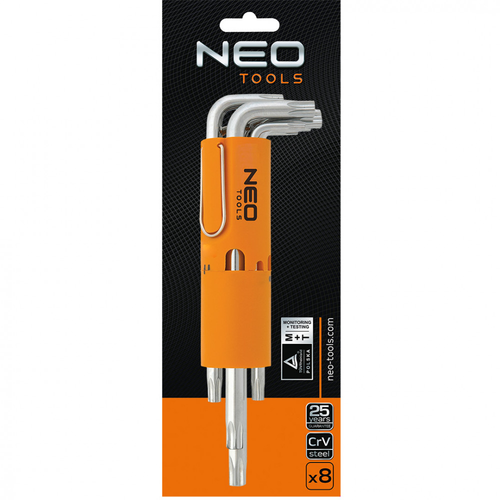 NEO furatos Torx kulcskészlet 8 db kulccsal, TT10 - TT50 közötti méretekben, króm-vanádium acélból. A szett praktikus csomagolásban kapott helyet. A termék megbízhatóságát bizonyítja a 25 éves jótállás. A NEO márka a professzionális igényeket is kielégíti.