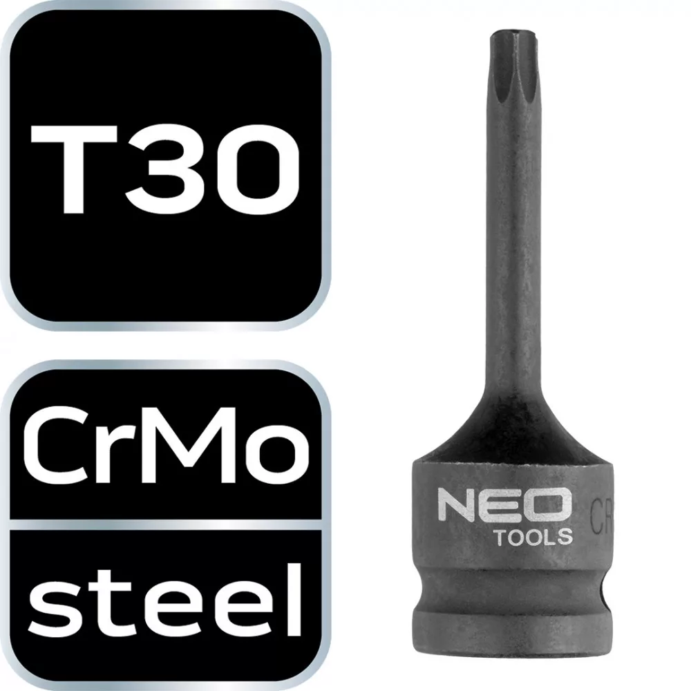 NEO torx bit 1/2", ütvecsavarozókhoz. Króm-molibdén acélból készült - ellenáll a korróziónak, a dinamikus ütésterhelésnek és a magas hőmérsékletnek. A golyós biztosító védelmet nyújt a kulcs kicsúszása ellen. A NEO márka megfelel a szakemberek igényeinek.