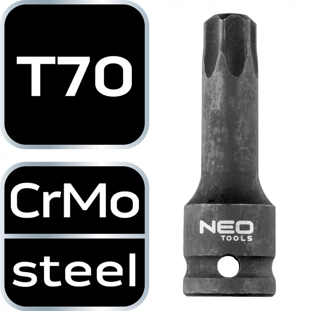 NEO torx bit 1/2", ütvecsavarozókhoz. Króm-molibdén acélból készült - ellenáll a korróziónak, a dinamikus ütésterhelésnek és a magas hőmérsékletnek. A golyós biztosító védelmet nyújt a kulcs kicsúszása ellen. A NEO márka megfelel a szakemberek igényeinek.