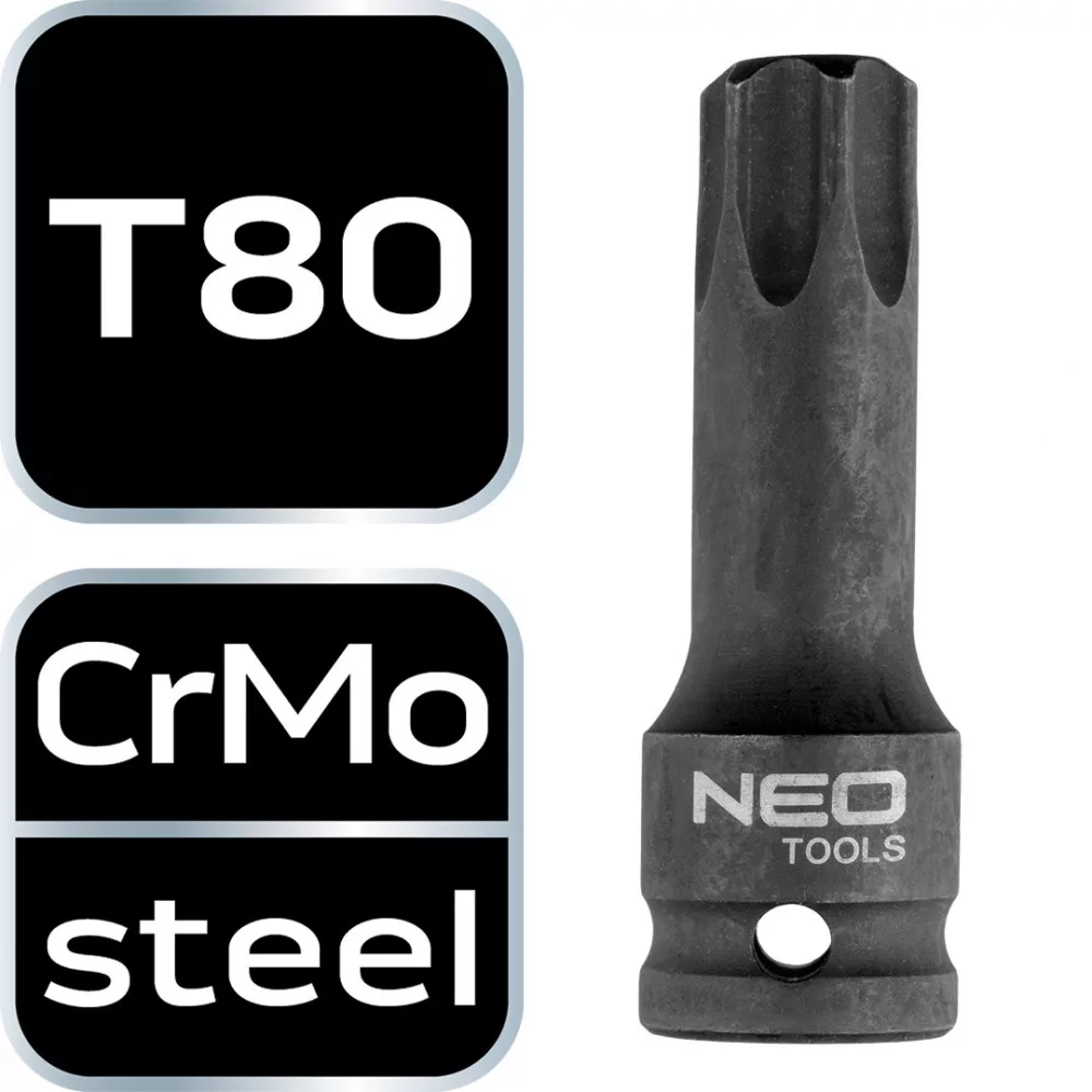 NEO torx bit 1/2", ütvecsavarozókhoz. Króm-molibdén acélból készült - ellenáll a korróziónak, a dinamikus ütésterhelésnek és a magas hőmérsékletnek. A golyós biztosító védelmet nyújt a kulcs kicsúszása ellen. A NEO márka megfelel a szakemberek igényeinek.