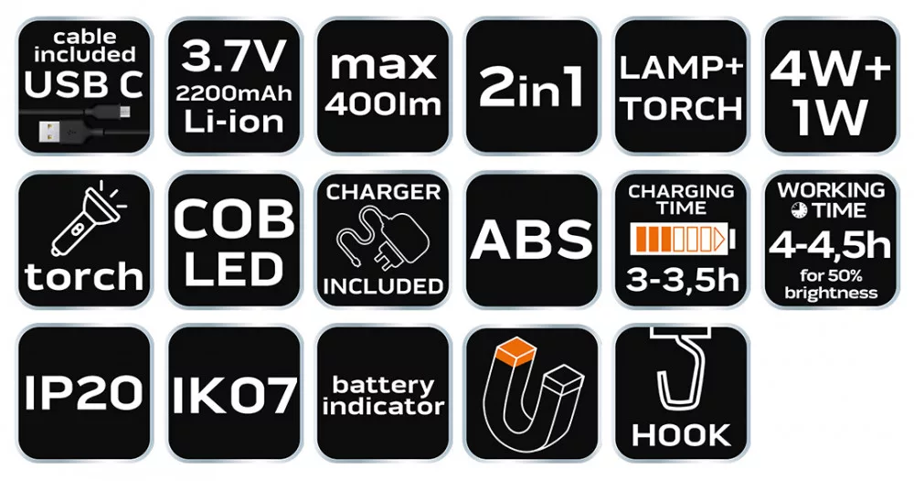 A NEO újratölthető műhelylámpa + zseblámpa egy kiváló minőségű és sokoldalú világítóeszköz a következő kulcsjellemzőkkel:Fényerő és Teljesítmény: 4W kimeneti teljesítménnyel rendelkezik, beleértve egy 1W elülső zseblámpát is. Összesen 400 lumen fényerőt biztosít.Rugalmas Fej: A lámpa rugalmas fejjel rendelkezik, amely lehetővé teszi a fény bármilyen irányba történő irányítását, ezáltal optimalizálva a munkaterület megvilágítását.Akkumulátor és Töltés: Li-ion 3,7 V 2200 mAh kapacitású akkumulátorral és USB C porttal van felszerelve. Az üzemidő a fényerőtől függően változik: 50%-os fényerőnél 4-4,5 óra, 100%-os fényerőnél 2-2,5 óra. A zseblámpa üzemideje 9-10 óra. A töltési idő 3,5 óra.Töltöttségjelző: Az ABS-vázon található praktikus akkumulátor töltöttségjelző segít nyomon követni az akkumulátor állapotát.Vízállóság és Tartósság: IP20 vízállósági besorolással és IK07 csepp- és törésállósággal rendelkezik, így tartósan használható különböző körülmények között.Mágneses Talp és Akasztó: A lámpa talpán praktikus mágnessel és akasztóval rendelkezik, amely megkönnyíti a felakasztást vagy rögzítést a munkahelyen., Kiegészítők: USB C kábellel és 5V DC 1A töltővel együtt kínálják, így könnyen újratölthető és használható.Ez a NEO műhelylámpa kiváló választás lehet számos munkaterületen, különösen műhelyekben és szerelők számára, akiknek sokoldalú és erős fényforrásra van szükségük a munkájuk során.