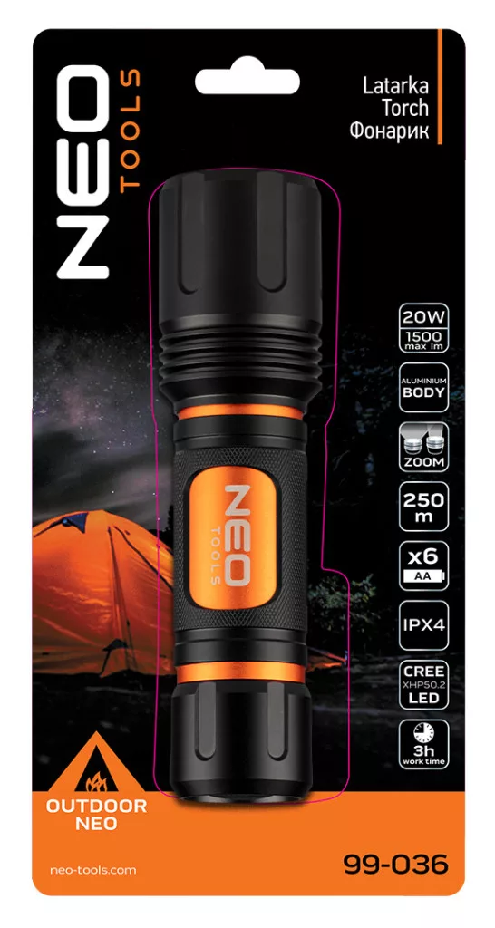 Ez a NEO akkumulátoros zseblámpa ideális választás lehet mindennapi használatra, kempingezéshez vagy bármilyen szabadtéri tevékenységhez, ahol erős és fókuszált fényre van szükség. A különböző fényfunkciók és a zoom lehetőségei lehetővé teszik, hogy minden körülmények között hatékonyan használja a lámpát. A CREE XHP50.2 LED-ek 1500 lumen fényerőt és 20 W teljesítményt biztosítanak. A zoom funkció lehetővé teszi a fókuszált fény szélesítését vagy összeszűkítését a környezeti igényeknek megfelelően. A zseblámpa hat AA elemmel működik (nem tartozék), így nincs szükség tölthető akkumulátorokra vagy más energiatároló eszközökre. Az alumínium test a lámpát könnyűvé és tartóssá teszi, valamint ellenáll a külső behatásoknak. Három Fényfunkció: Válassza ki az 100%, 20% és stroboszkóp funkciók közül az adott helyzetnek megfelelően. Kompakt mérete lehetővé teszi, hogy könnyen hordozza a zseblámpát bárhová, és mindig kéznél legyen. Fedezze fel a NEO zseblámpa előnyeit, és élvezze a megbízható megvilágítást!
