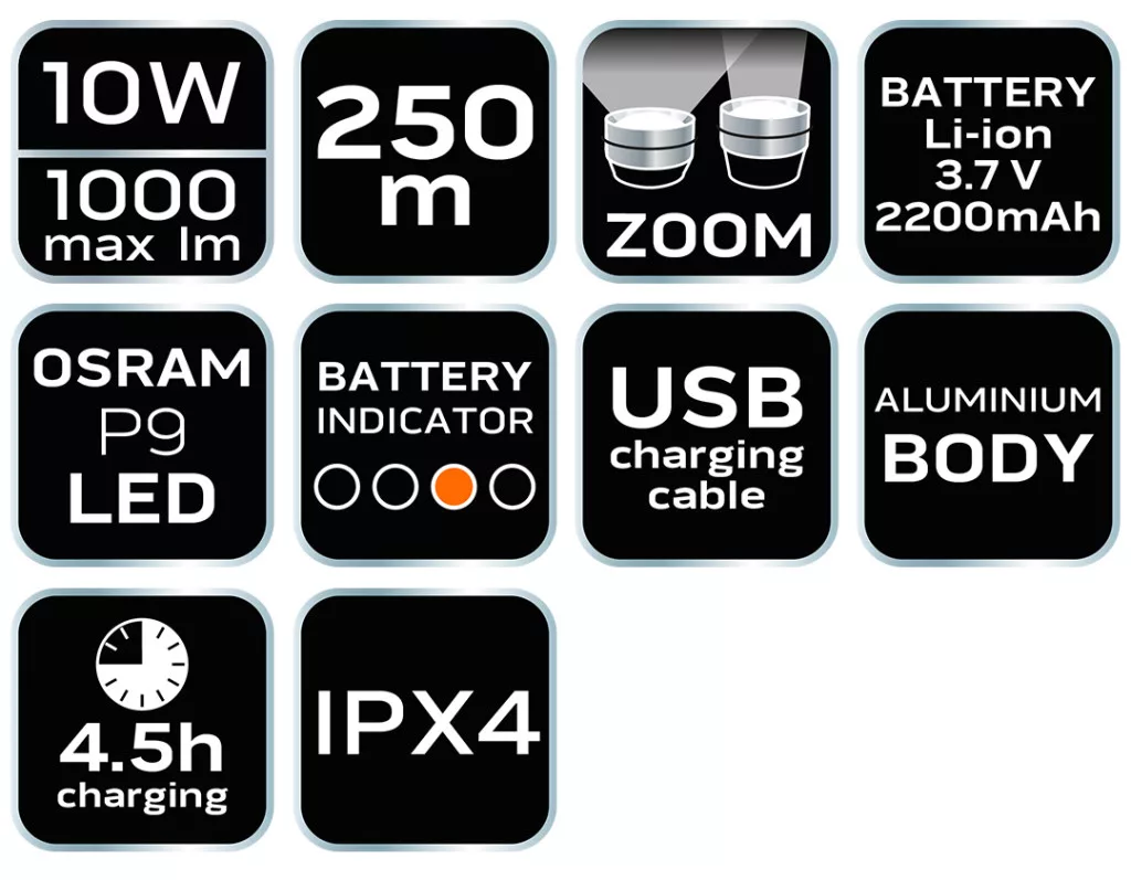 Ez a NEO vezeték nélküli zseblámpa kiváló választás lehet mindennapi használatra, sátrazáshoz vagy éjszakai kempingezéshez. Az erős fényerő, a zoom funkció és a különböző fényfunkciók lehetővé teszik, hogy minden körülmények között megbízható fényforrásként használja. Az OSRAM P9 LED-ek 1000 lumen fényerőt és 10 W teljesítményt biztosítanak. A zoom funkció lehetővé teszi a fókuszált fény szélesítését vagy összeszűkítését a környezeti igényeknek megfelelően. A 250 méteres maximális hatótávolság kiváló láthatóságot biztosít, akár távoli célpontok megvilágításáról van szó. A 3,7 V-os, 2200 mAh kapacitású Li-Ion akkumulátorral a zseblámpa könnyen újratölthető, így mindig készen áll a használatra. Az alumínium test a lámpát könnyűvé és tartóssá teszi, valamint ellenáll a külső behatásoknak. Négy Fényfunkció: Válasszon az 100%, 40%, 10% és stroboszkóp funkciók közül az adott helyzetnek megfelelően. A készlet tartalmaz egy USB-kábelt, így könnyen és gyorsan töltheti fel a zseblámpát bármilyen USB-porton keresztül. Fedezze fel a NEO zseblámpa előnyeit, és élvezze a modern és hatékony világítást!