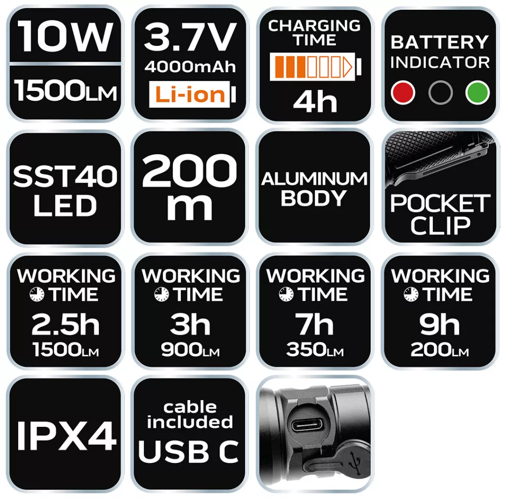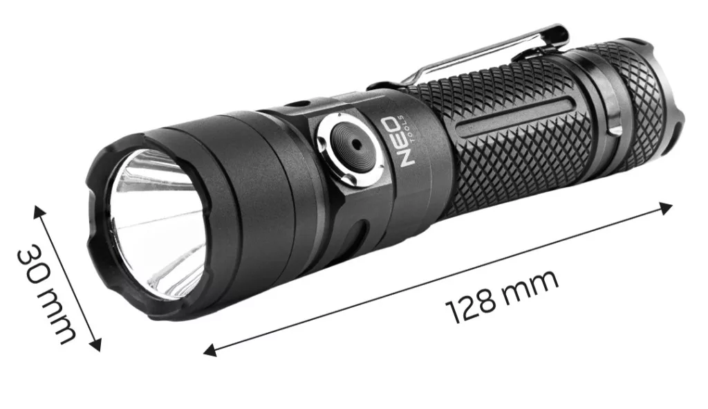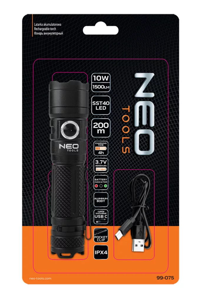 A NEO USB C 1500 lm SST40 LED-es újratölthető zseblámpa egy praktikus eszköz 10 W-os teljesítményű és 1500 lm-es lámpával. Az SST40 ledes fényjelzés az ütésekkel és időjárási körülményekkel szembeni nagyfokú ellenállást jelzi. A zseblámpa 3,7 V 4000 mAh lítium-ion akkumulátorral rendelkezik. A teljes feltöltési idő körülbelül 5 óra. A készülék beépített akkumulátortöltési előrehaladásjelzővel rendelkezik. Egy teljesen feltöltött zseblámpa körülbelül 160 perctől akár 9 óráig is világíthat (a fényerősségtől függően). Jellemzője a 200 m-es hatótávolság és az SOS funkció. Az USB C kábel csatlakoztatására szolgáló aljzat testébe épített aljzatot egy gumifülke megfelelően védi a külső tényezőkkel szemben. A zseblámpa kényelmes burkolata alumíniumból készült. A zseblámpa különböző túrákra, túlélő túrákra vagy otthoni használatra ajánlott.