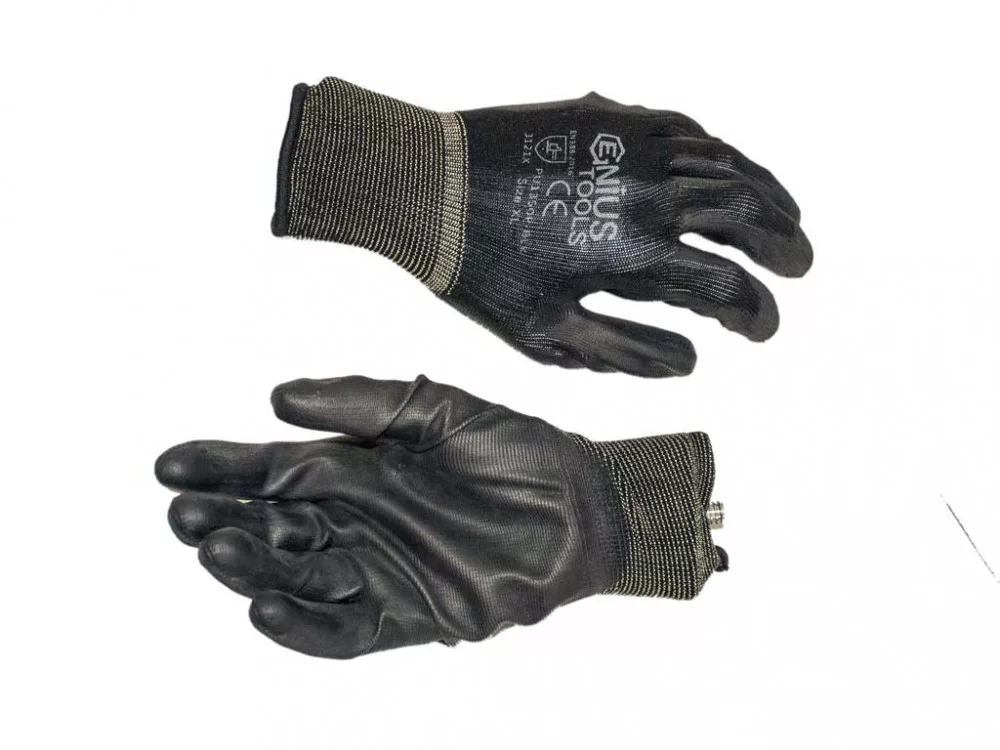 Fekete poliészter szőtt kesztyű fekete tenyérmártott védőbevonattal, mely jó fogást biztosít száraz környezetben.