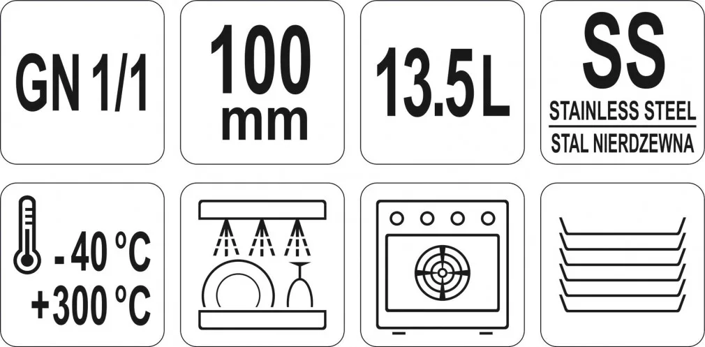 A GN tárolóedényeket élelmiszerek hűtési és fagyasztási körülmények közötti tárolására tervezték - akár -40°C-ig. Ideálisak magasabb - akár 300 °C-os - hőmérsékleten történő használatra is. Ennek köszönhetően a kombi gőzölők technológiájában is felhasználhatók.