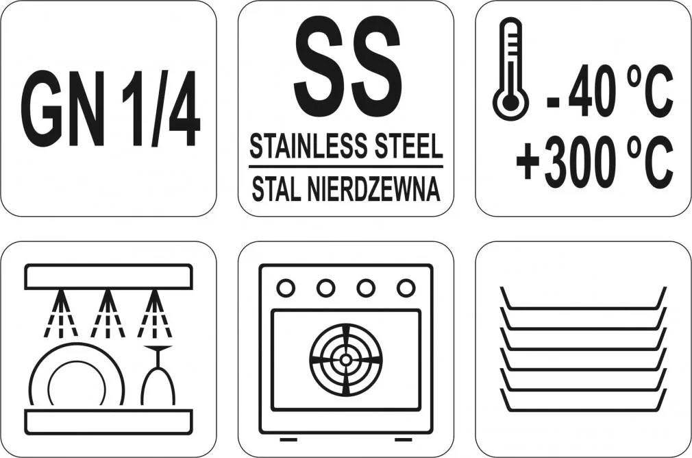 A GN YATO tárolók fedeleit professzionális használatra tervezték közösségi étkeztetési létesítményekben. Az élelmiszerek hűtésére és fagyasztására használják, akár -40°C-ig, valamint magasabb hőmérsékleten, akár 300°C-ig történő munkavégzésre is ideálisak, így alkalmasak konvekciós és gőzölő sütő technológiában való használatra.