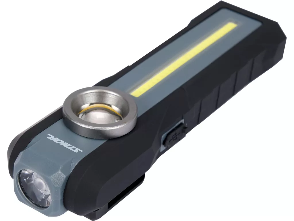 Műhelylámpa három fényforrással. Akasztóra vagy klipszre akasztható. Az aljába egy mágnes van elhelyezve. A megvilágítás szöge az összecsukható háznak köszönhetően állítható. A következő sorrendben működik: teljesítmény LED - kerek COB LED - hosszú COB LED.