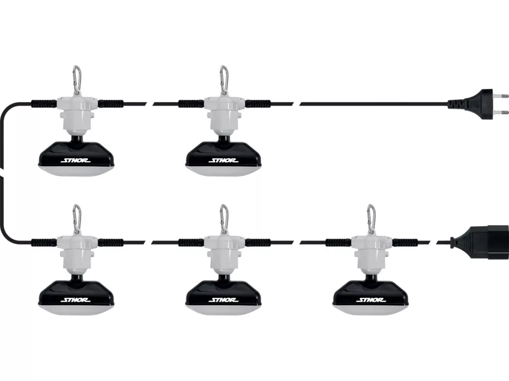 5 darab COB reflektorból álló készlet, összesen 4500 lm teljesítményű. A reflektorok 15,4 m-es kábellel vannak összekötve. A készletek kombinálhatók (maximum 10 készlet). Minden reflektor kampóval rendelkezik a felakasztáshoz.