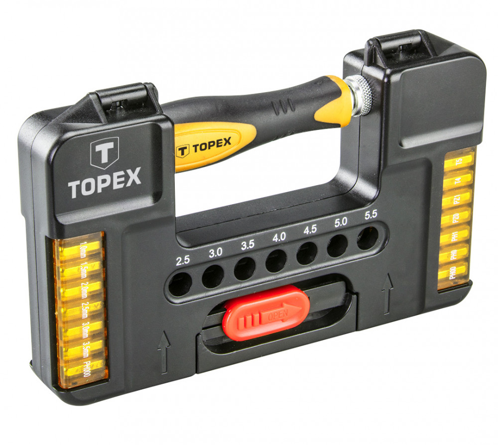 Precíz csavarbehajtó bitek hajtókarral (ref. sz. 39D343), 37 db-os készlet, hajtókar, hosszabbító 100 mm, 28 precíz csavarozó hegy, méretek: lapos 1 mm, 1.5 mm, 2 mm, 2.5 mm, 3 mm, 3.5 mm kereszt PH000, PH00, PH0, PH1, PZ0, PZ1, Torx T4, T5, T6, T7, T8, T9, T10, T15, T20, hatlapú H0.7, H0.9, H1.3, H2, H2.5, H3, H4, 7 dugókulcs, méretek: 2.5, 3, 3.5, 4, 4.5, 5, 5.5 mm, CrV acél, műanyag tok