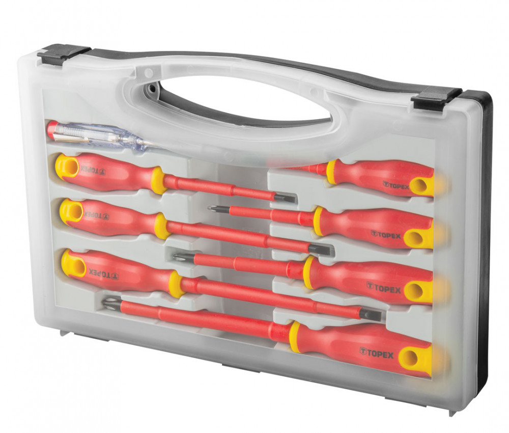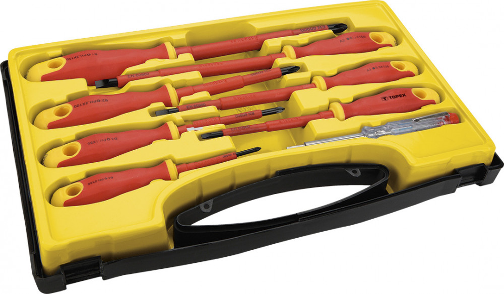 A csavarhúzókészlet a legfeljebb 1000 V feszültség alatti munkákra szolgál. A hét csavarhúzó mindegyike kiváló minőségű króm-vanádium acélból készült és szigetelt. Ezen felül a készlet tartalmaz egy 125-250 V között használható fázisceruzát is. Az ergonómikus, csúszásmentes anyaggal bevont műanyag markolat biztosítja a kényelmet és a biztonságot a munkavégzés során. A TOPEX márka ezermestereknek készül.