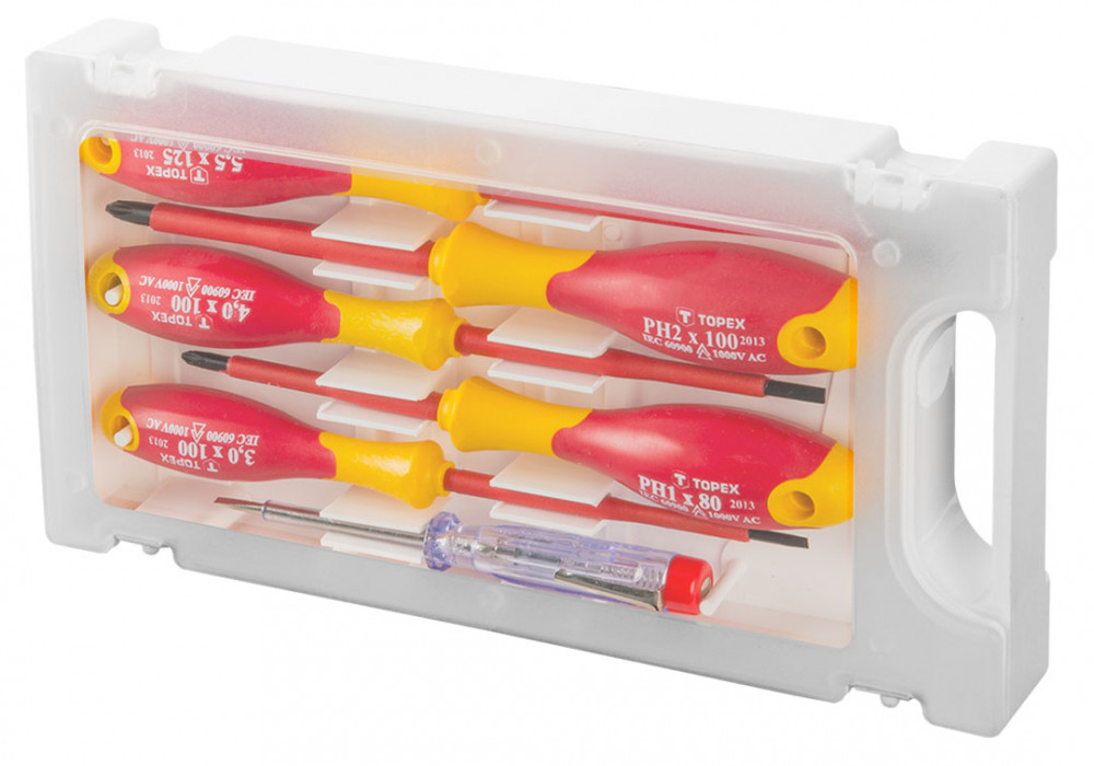 A TOPEX csavarhúzókészlet a legfeljebb 1000 V feszültség alatti munkákra szolgál. Az öt csavarhúzó mindegyike kiváló minőségű króm-vanádium acélból készült. Ezen felül a készlet tartalmaz egy 125-250 V között használható fázisceruzát is. Az ergonómikus, csúszásmentes anyaggal bevont műanyag markolat biztosítja a kényelmet és a biztonságot a munkavégzés során. A TOPEX márka ezermestereknek készül.