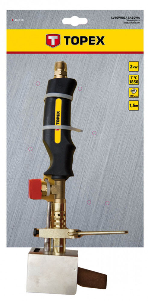 TOPEX gázforrasztó, 2 kW teljesítmény, 1850 °C üzemi hőmérséklet. A készletben van egy 1,5 m-es gumitömlő is. Fémelemek forrasztására szolgál. Kitűnően beválik a bádogos munkában. A TOPEX márka ezermestereknek készül.