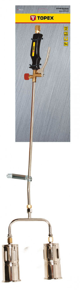 TOPEX bádogos forrasztó készlet, 110 kW teljesítmény, 1850 °C üzemi hőmérséklet. Készlet tetőfedési munkákhoz. Felszerelése 2 égőfej, hosszú, 50 cm-es szár, valamint hosszú, 5 m-es tömlő. A hosszú szár javítja a munkavégzés kényelmét és biztonságát. A TOPEX márka ezermestereknek készül.