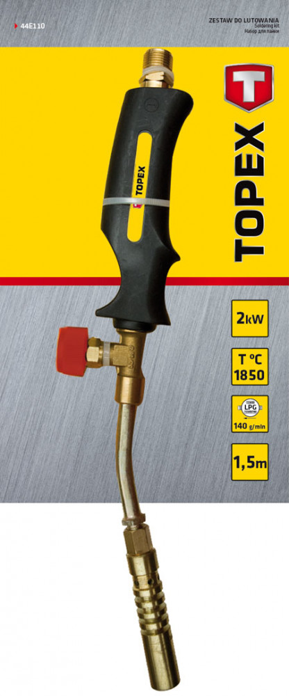 TOPEX forrasztókészlet 2 kW teljesítményű égőfejjel és 1850 °C lánghőmérséklettel. Az égőfej sárgaréz, 17 mm átmérőjű fúvókával. 1,5 m hosszú tömlővel. A készlet kitűnően beválik a műhelymunkában, illetve réz csőhálózatok forrasztásához. A TOPEX márka ezermestereknek készül.