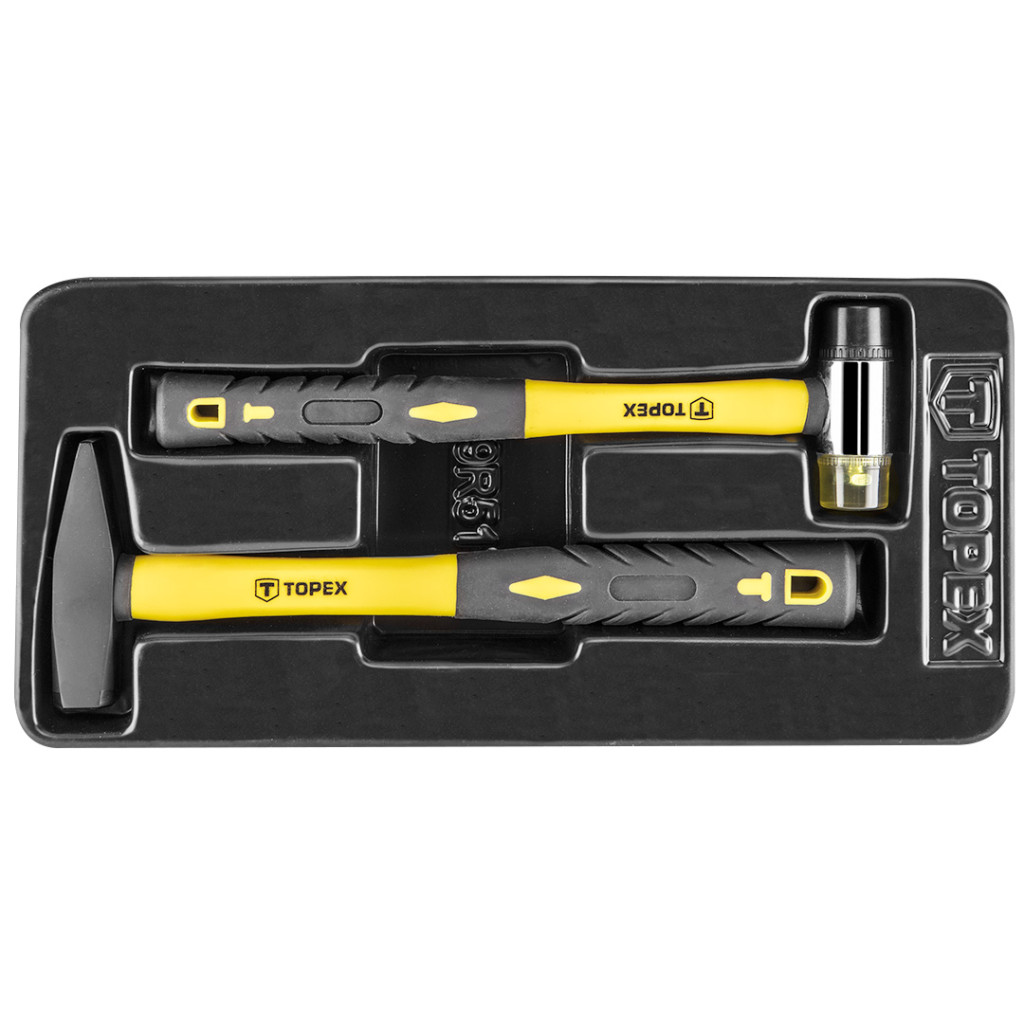 TOPEX kalapács készlet, műhelykocsi tálcával. 2 db (ref.sz. 79R517) Nyele a hőmérséklet változásokkal, a nedvességgel és a mechanikus sérülésekkel szemben kivételesen ellenálló üvegszálas anyagból készült, aminek nagy jelentősége van a műhelymunkák során. Az ergonomikus kialakítású gumi markolat révén a munkavégzés kifejezetten kényelmessé válik. A TOPEX márka ezermestereknek készült.