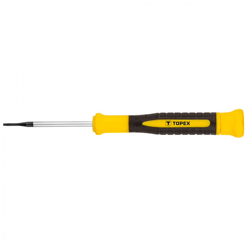 A TOPEX Torx műszerész csavarhúzó kiválóan beválik szerelési, barkácsolási munkákban. Hegye nagy ellenállóképességű, a szerszámnak hosszú élettartamot biztosító króm-vanádium acélból készült. Az edzett acélból készülő mágneses hegy megkönnyíti a szerszámmal végzett munkát A forgó feltétje funkcionalitását bővíti, lehetővé teszi a szerszám pontosabb vezetését. Az ergonómikus, csúszásmentes anyaggal bevont műanyag markolat biztosítja a kényelmet és a biztonságot a munkavégzés során. A TOPEX márka ezermestereknek készül.