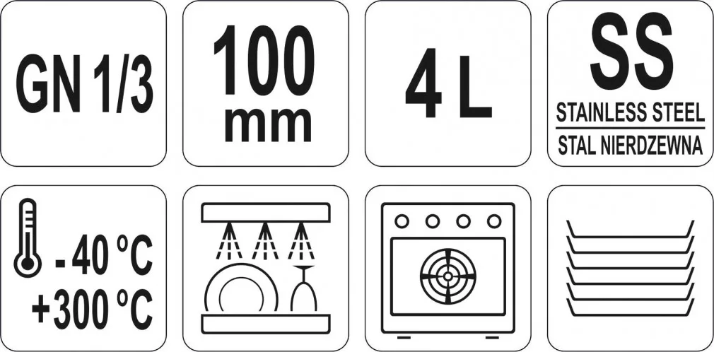 A GN tárolóedényeket élelmiszerek hűtési és fagyasztási körülmények közötti tárolására tervezték - akár -40°C-ig. Ideálisak magasabb - akár 300 °C-os - hőmérsékleten történő használatra is. Ennek köszönhetően a kombi gőzölők technológiájában is felhasználhatók.