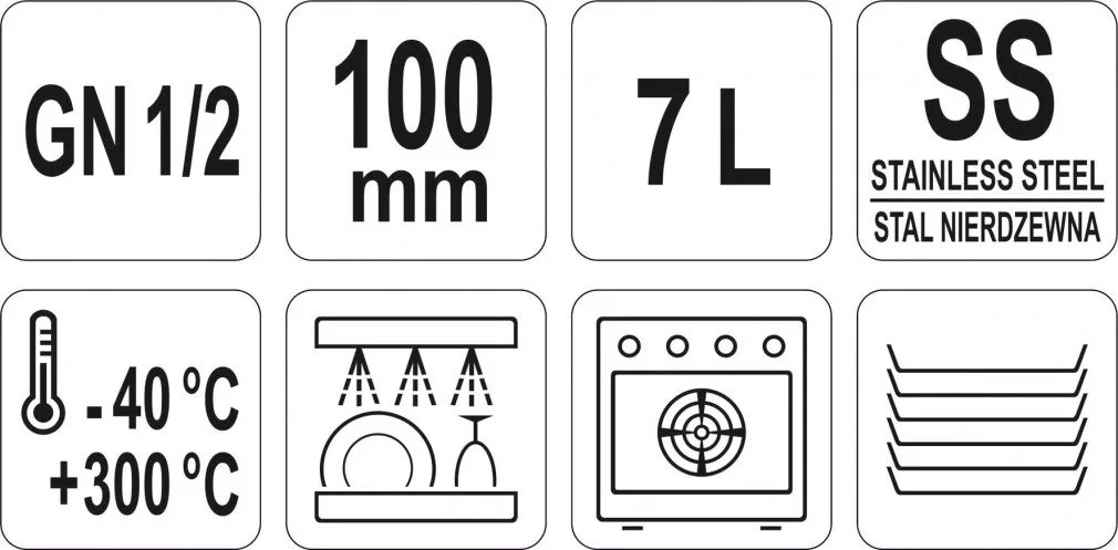 Professzionális GN tárolóedény a YATO-tól, rozsdamentes acélból, GN 1/2 méretben, 100 mm magas, kapacitása 7,0 liter. A YATO professzionális konyhai eszközöket közösségi étkeztetési létesítmények számára tervezték. A legmagasabb minőségű 201 típusú rozsdamentes acélból készültek, matt és sima felülettel, a Gastro PN-EN 631-1:1996 szabványok szerint.