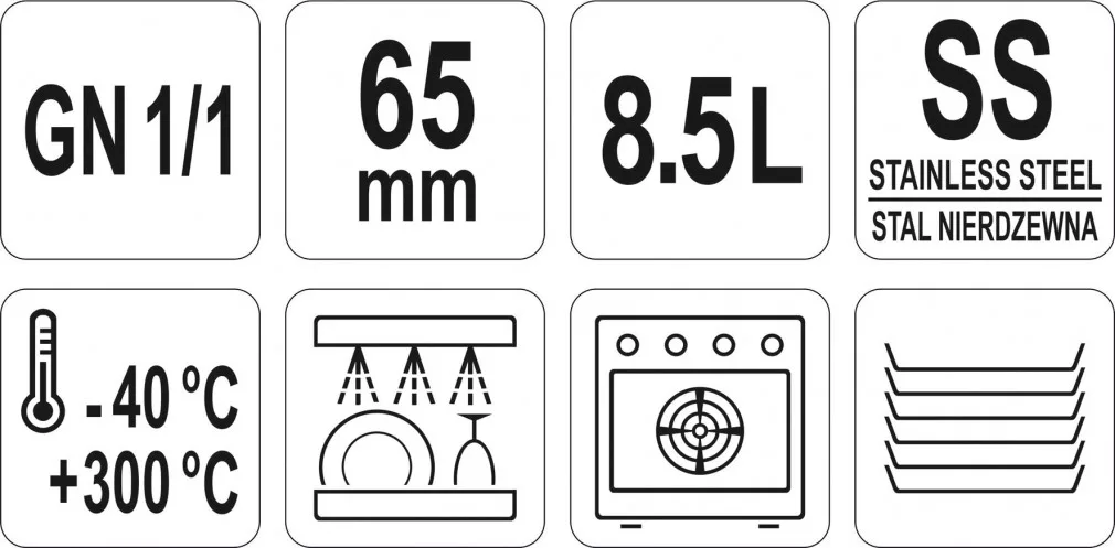 YATO professzionális rozsdamentes acél GN tartályok GN 1/1, 65 mm, 8,5 l űrtartalom.