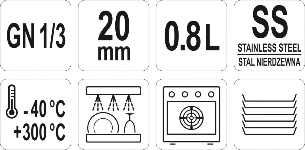 YATO professzionális rozsdamentes acél GN tartályok, GN 1/3 méret, 20 mm, űrtartalom 0,75 l.