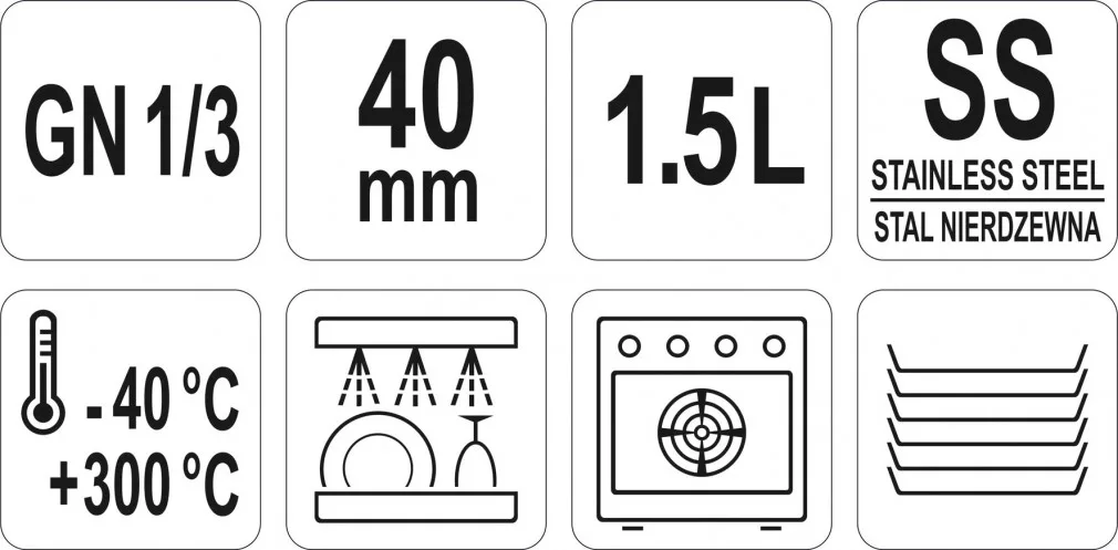 A GN tárolóedényeket élelmiszerek hűtési és fagyasztási körülmények közötti tárolására tervezték - akár -40°C-ig. Ideálisak magasabb - akár 300°C-os - hőmérsékleten történő használatra is. Ennek köszönhetően a kombi gőzölők technológiájában is felhasználhatók.