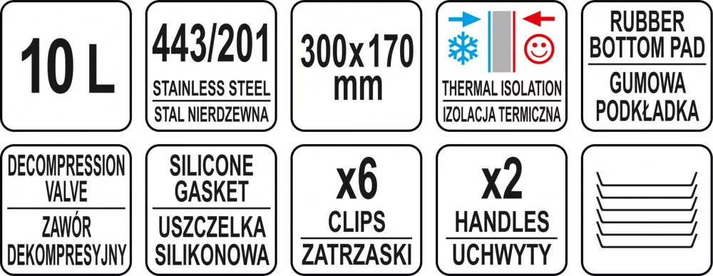 A szigetelt tartály két rozsdamentes acélból készült, masszív fogantyúval van ellátva a könnyű szállítás érdekében, és hat, a fedelet záró pattintós záróelemmel. Ezen elemek kiváló minősége és tartóssága garantálja a hosszú évekig tartó problémamentes használatot.