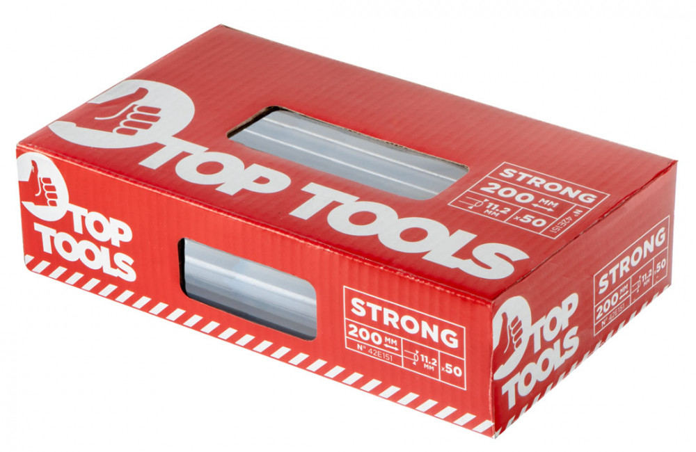 Top Tools 11 mm átmérőjű, 200 mm hosszú ragasztórúd (cikkszám: 42E151). 50 db-os csomagolás. A ragasztót átlátszósága univerzálisan felhasználhatóvá teszi. Tökéletesen beválik a barkácsműhelyben és a profi alkalmazásokban is, pl. padlószőnyegek fektetésében, bútorok készítésében élelmiszerekkel nem érintkező alkatrészek tömítéséhez, ragasztásához. Alkalmas műanyagok, szövetek, porcelán, bőr, papír ragasztására. A termék PZH tanúsítvánnyal rendelkezik.