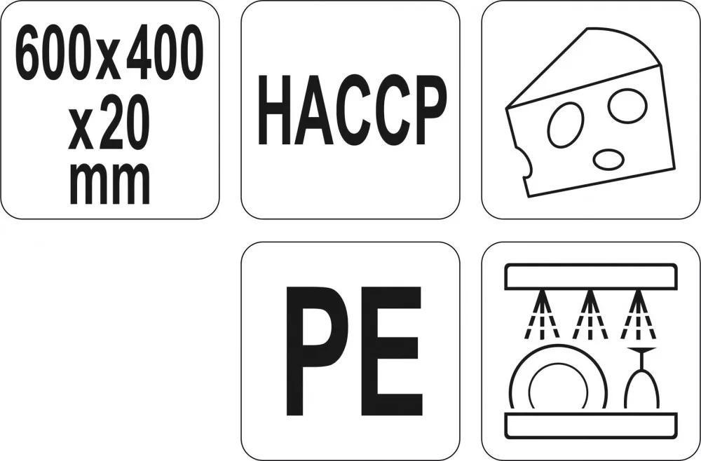 Univerzális vágódeszka a gasztronómiában való használatra. Fehér színben készül, a HACCP-jelölési rendszernek megfelelően, és tejtermékekkel való érintkezésre szolgál. Kiváló minőségű, 20 mm vastagságú polietilénből készült, amely nagy szilárdságot és tartósságot garantál. A kétoldalas, csúszásgátló felülettel ellátott deszka megakadályozza a termék csúszását vágás közben. A lekerekített élek és a gondos kivitelezés növeli a biztonságot munka közben. A YATO tábla könnyen tisztán tartható. A gasztronómiában általánosan elterjedt tisztítószerekkel mosható. A mosogatás is lehetséges.