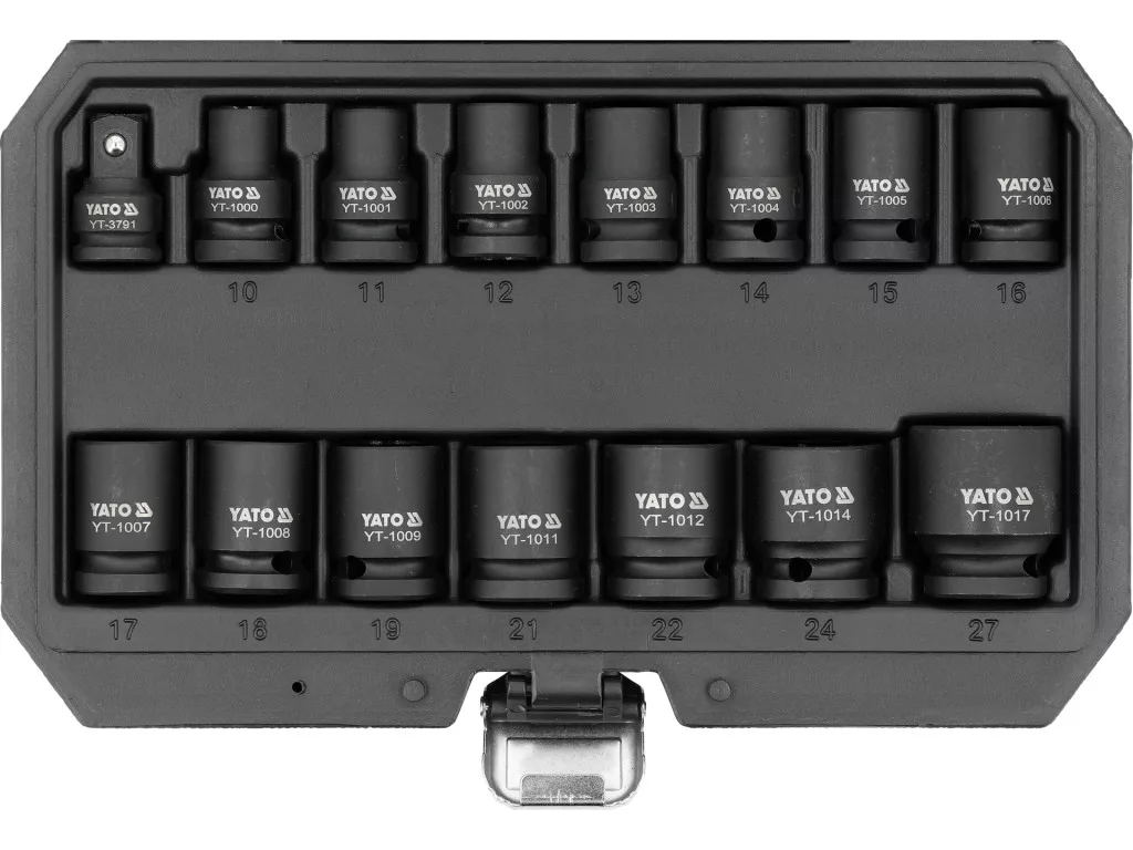 tartalmazza a 14 hatlapú dugót méretekben: 10, 11, 12, 13, 14, 15, 16, 17, 18, 19, 21, 22, 24, 27 mm és egy redukciót 3/8" (Női) x 1/2" (Férfi)