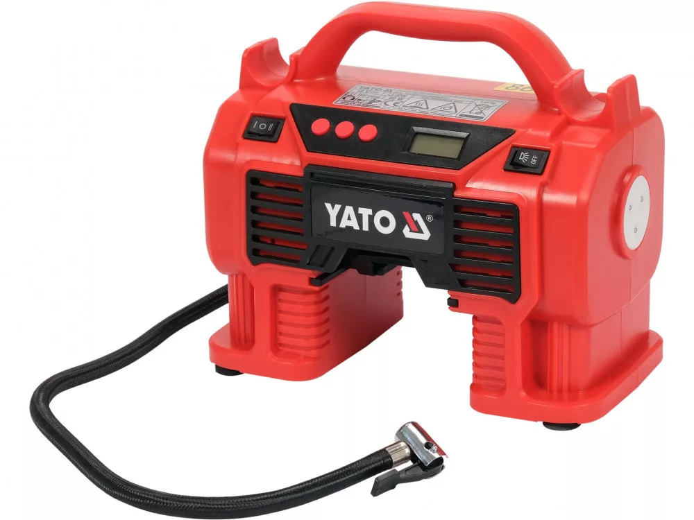 Kompakt kompresszor, amelyet a YATO 18 voltos rendszerakkumulátor és 12 voltos szivargyújtó aljzat táplál. Egység akkumulátor nélkül.