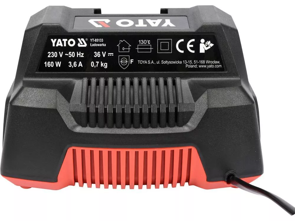 A YATO YT-85133 töltő az YT-85090 láncfűrészben használt Li-Ion 40V/2,5Ah YT-85132 akkumulátor töltésére szolgál. A készülék LED-es töltésjelzővel és hűtőrendszerrel rendelkezik: a ventilátor hűti az akkumulátort töltés közben. A készülék automatikusan kikapcsol, amikor az akkumulátor feltöltődik.