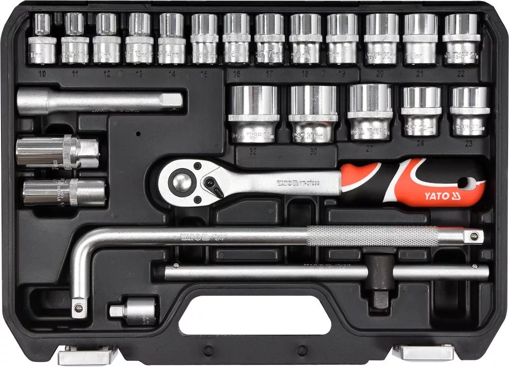Professzionális minőségű szerszámkészlet a Yato-tól, szervizek és műhelyek számára ajánlott. A dugókulcskulcsok és a dugókulcshajtás tartós króm-vanádium acélból CrV 50BV30 készül. A foglalatok AS-Drive rendszerrel rendelkeznek, amely 25%-kal növeli a maximális nyomatékot, miközben teljes mértékben védi az anya éleit, a foglalatok kéttónusú felületkezeléssel rendelkeznek. A racsni háromkomponensű fogantyúval és 72 foggal (5 fokos elmozdulás) rendelkezik.