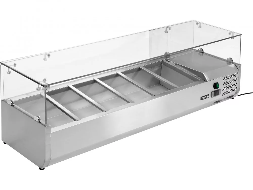 A YATO hűtött vitrines bemutató állvány 1400x335x435 mm-es méretekkel rendelkezik, és 6 GN 1/4 méretű tartály befogadására képes, amelyek maximális mélysége 150 mm lehet.