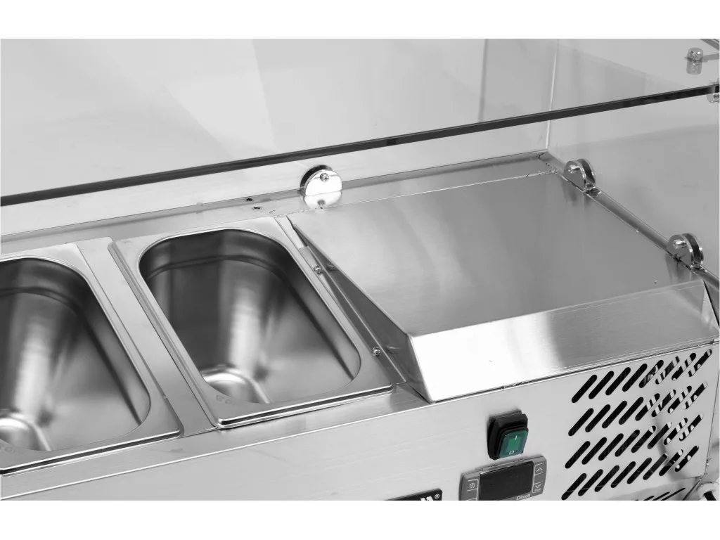 Az YATO 1800x335x435mm méretekkel rendelkező hűtő 8 db GN 1/4 tárolóra lett tervezve, melyek maximális mélysége 150 mm.