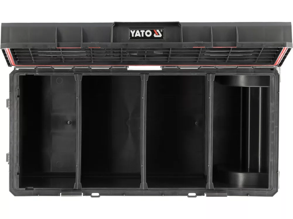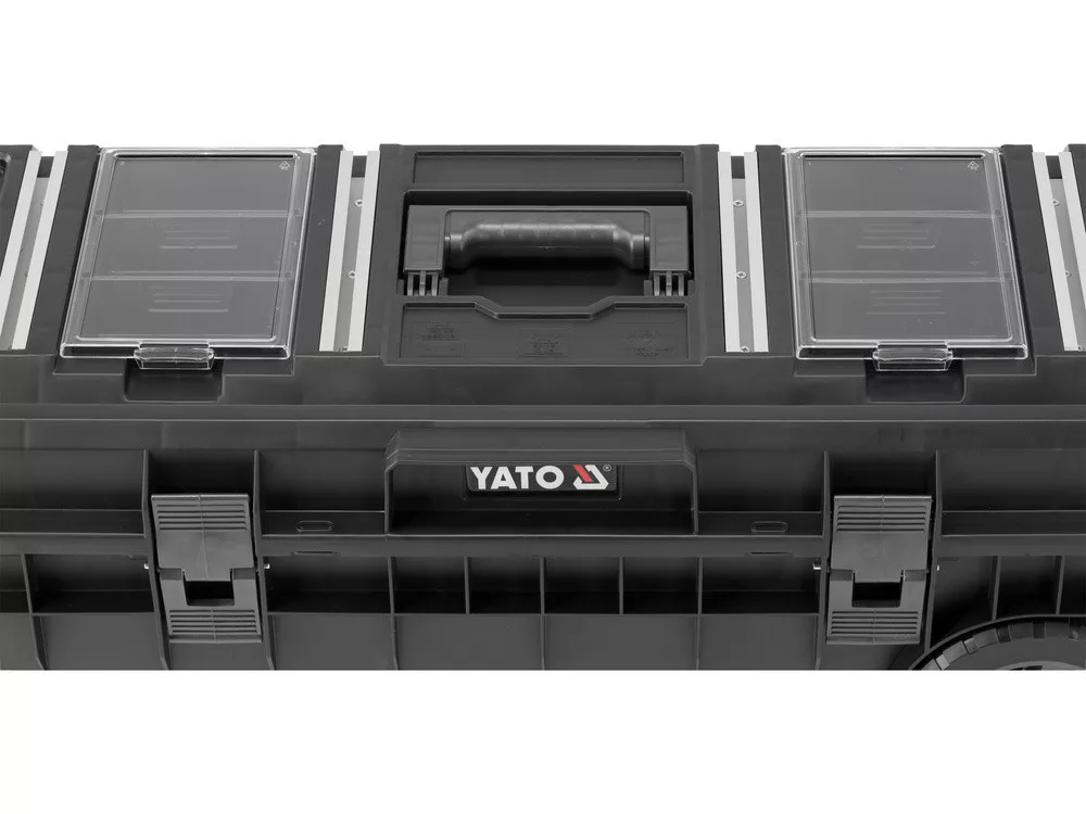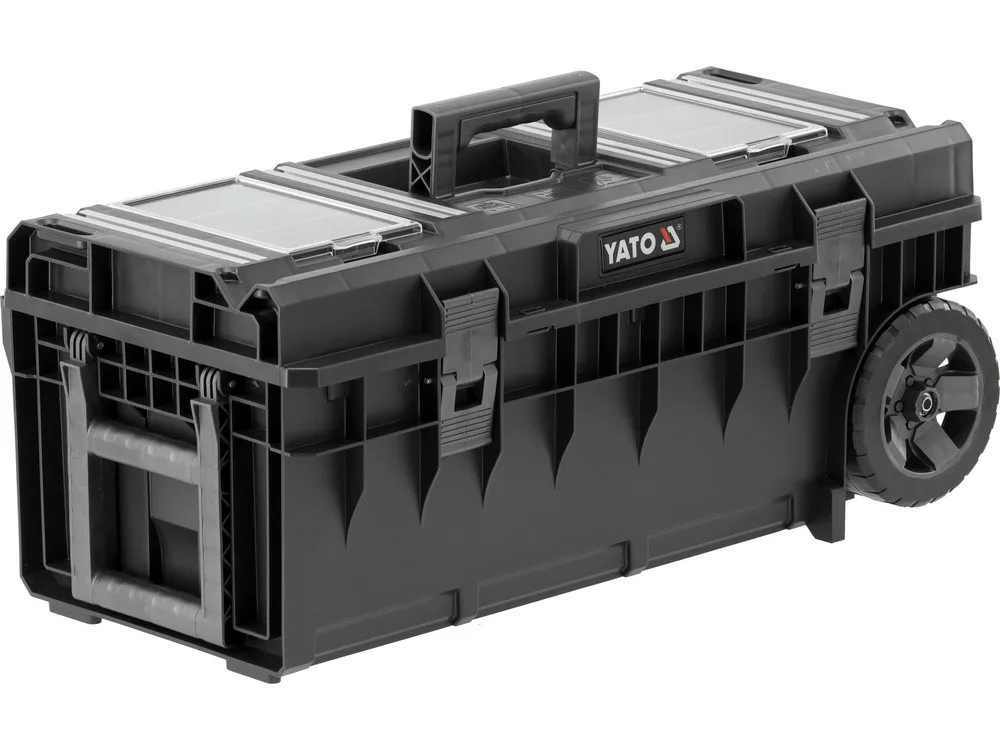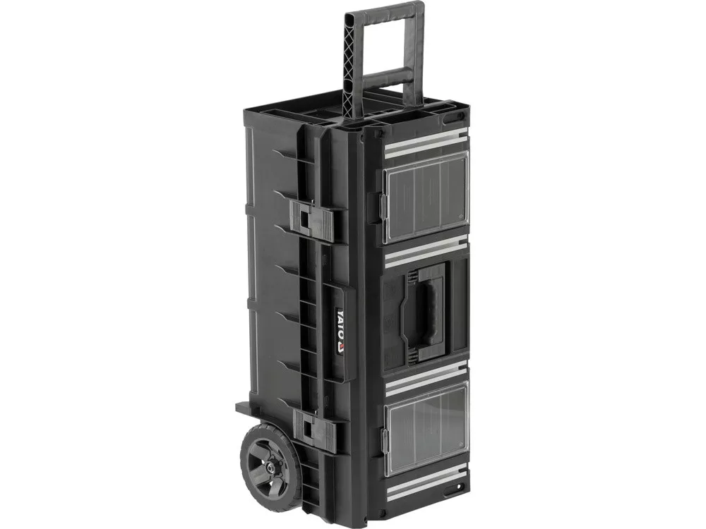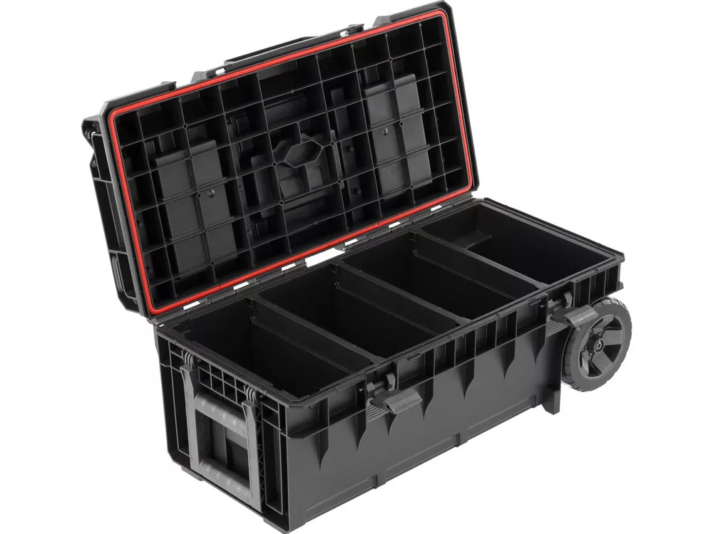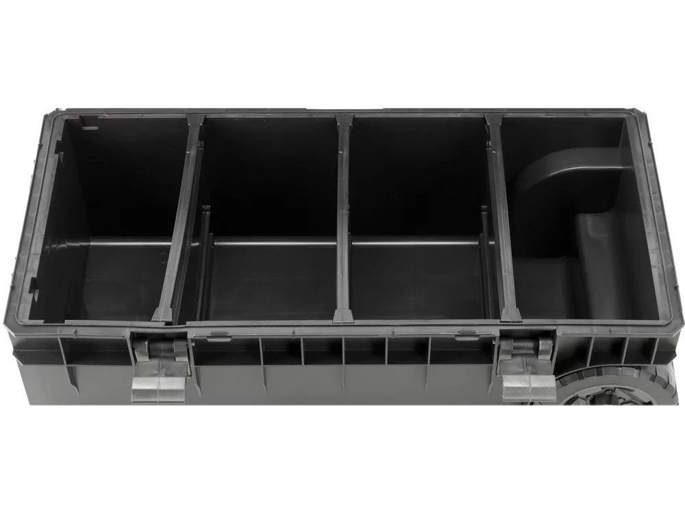 A tágas, ergonomikus láda kerekeken lehetővé teszi a szerszámok és apró elemek kényelmes tárolását és szállítását. Hosszú elektromos szerszámok, például ütvefúrók, cementkeverők szükséges tartozékokkal történő szállítására is alkalmas.