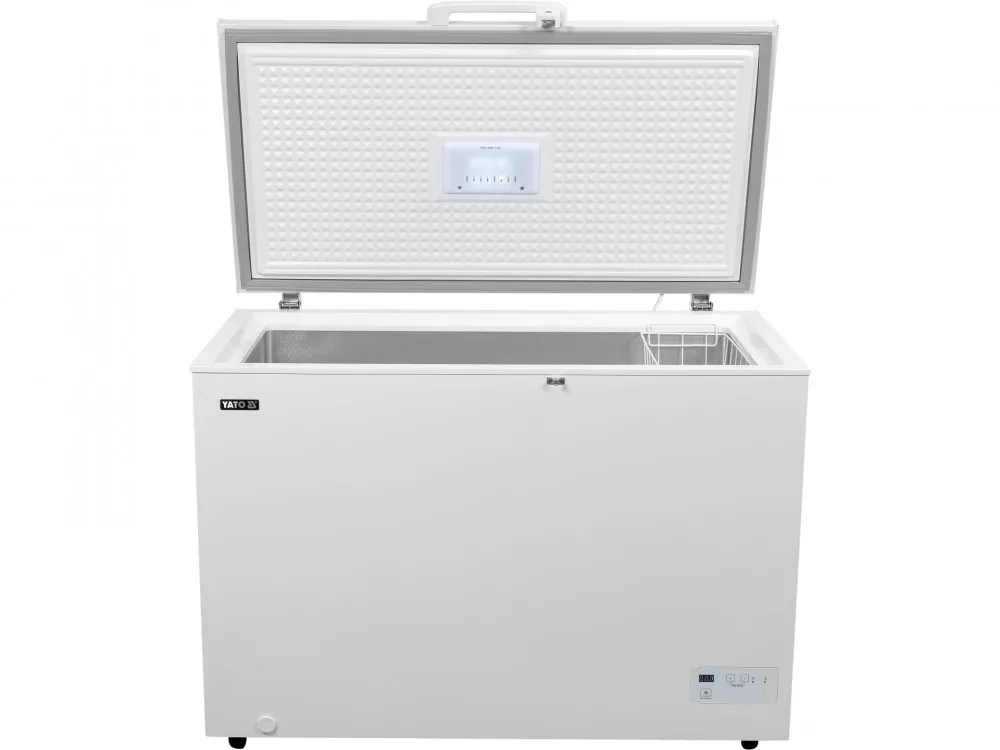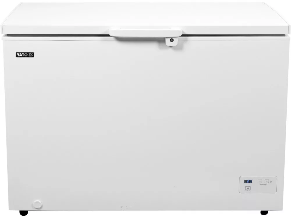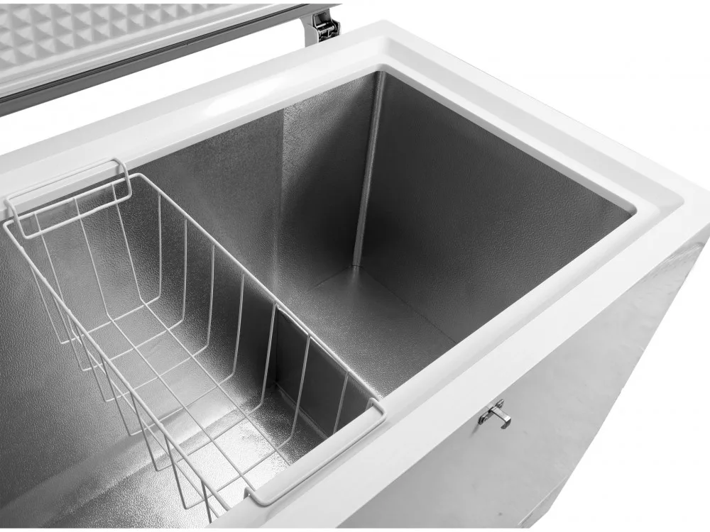 Egy fagyasztóláda a professzionális vendéglátáshoz. Önzáró, fogantyúval ellátott, zsanéros ajtóval rendelkezik, zárral felszerelve.