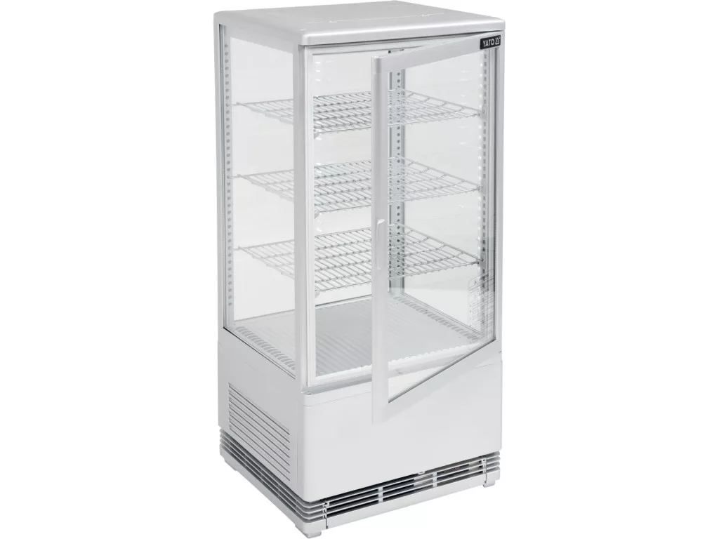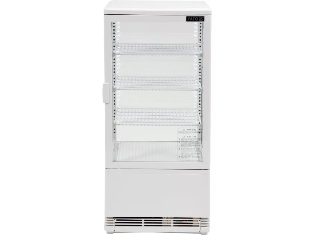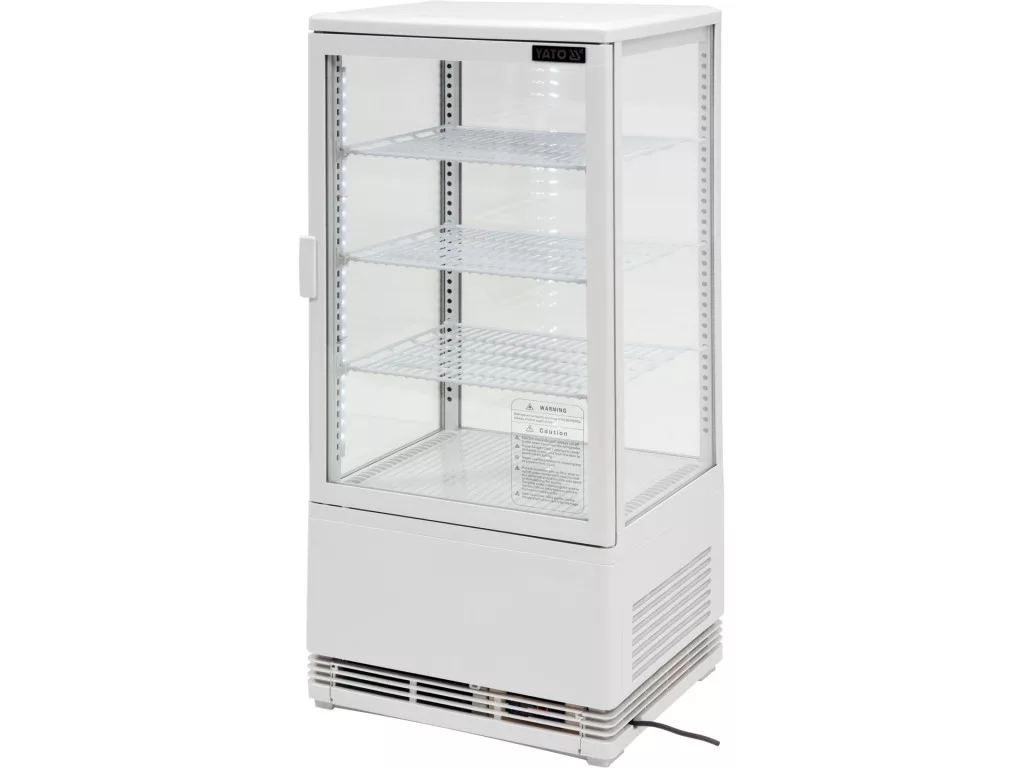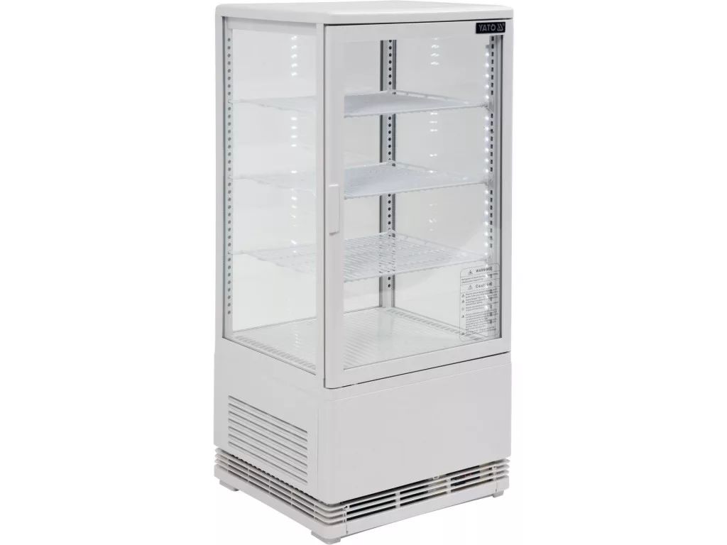 YATO szabadon álló hűtővitrin 78 literes űrtartalommal, fehér színben, 428x386x960mm méretekkel. A YATO hűtővitrin sütemények, torták, koktélok, joghurtok vagy különböző frissítő italok, valamint saláták vagy kisebb snackek bemutatására szolgál. A modern dizájn a kiváló minőségű alapanyagokkal kombinálva a YATO hűtővitrin tökéletes kirakatot biztosít minden típusú cukrászdában, kávézóban, étteremben, bárban vagy kiskereskedelmi üzletben. Ezenkívül a két oldalra szerelt LED-világítás nagyon vonzó módon tárja fel a bemutatott ételeket, így ösztönözve a vásárlókat a választásra. A YATO hűtővitrin kapacitása 78 liter, és három megerősített és védő PVC-bevonatú polccal rendelkezik, állítható rögzítési magassággal. Hozzáférésük nyitható üvegajtókon keresztül történik. Ezek kétrétegű edzett üvegből készültek, akárcsak az elülső és az oldalsó üveg. Ez nagy szilárdságot és ugyanakkor nagyon jó szigetelő tulajdonságokat biztosít. A kijelző 0~ +12°C hőmérséklet-tartományban működik R600a hűtőközeggel. Az alkalmazott kényszerhűtési technológia és az automatikus leolvasztási funkció azonban nagyon hatékony működést biztosít, miközben energiatakarékos is. Ezen kívül a kényszerhűtés funkció biztosítja a levegő egyenletes eloszlását a kijelzőegységben, így minden polcon egyenletes hőmérsékletet biztosít. Az átlagos éves energiafogyasztás 1003 kWh. A vitrin vezérlésehőmérséklet-kijelzővel ellátott elektronikus vezérlővel történik. Kávézók, cukrászdák, szállodák, éttermek, bárok, kiskereskedelmi üzletek, élelmiszerüzletek