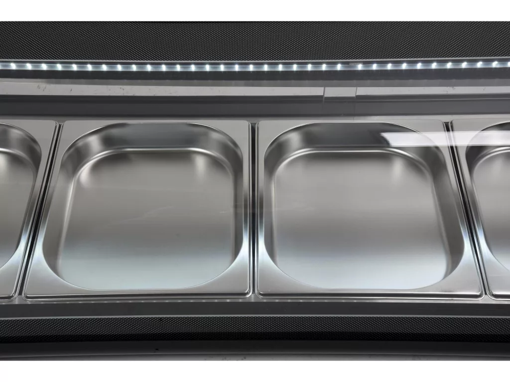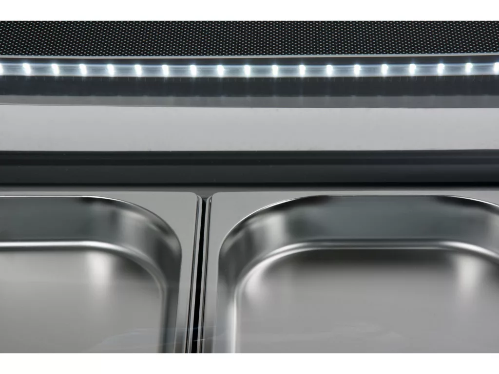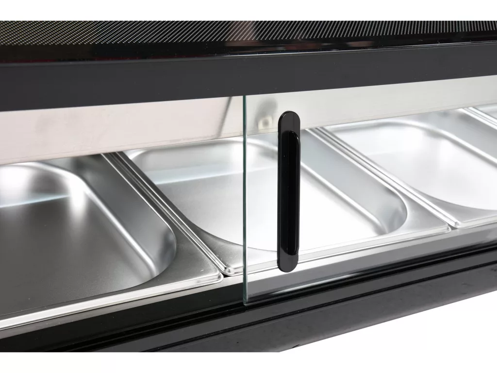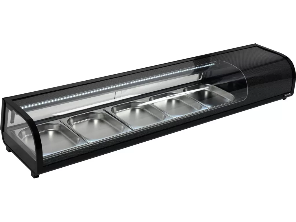 YATO hűtővitrin sushi 5x1/2GN A YATO hűtővitrin sushi, tapas vagy különféle előételek bemutatására szolgál. A modern dizájn a kiváló minőségű alapanyagokkal kombinálva teszi a YATO hűtővitrint tökéletes elülső vitrinné minden típusú étteremben vagy szállodában. A beszerelt LED-világítás ráadásul nagyon vonzó módon mutatja be a bemutatott ételeket, így ösztönözve a vendégeket a választásra. A YATO hűtőbővítménybe 5 db GN 1/2 rozsdamentes acéltartály fér, amelyek a készlet részét képezik. Hozzáférésük üveg tolóajtókon keresztül történik. Ezek edzett üvegből készültek, akárcsak a panorámás, lekerekített frontüveg. Ez nagy szilárdságot és ugyanakkor nagyon jó szigetelő tulajdonságokat biztosít. A kijelzőegység 0~ +12°C hőmérséklet-tartományban működik R600a hűtőközeggel. Az alkalmazott statikus hűtési technológia azonban a felső gőzfúvókával és automatikus leolvasztási funkcióval nagyon hatékony működést biztosít, miközben energiatakarékos. Az átlagos éves energiafogyasztás 1075 kWh. A bővítményt egyhőmérséklet-kijelzővel ellátott elektronikus vezérlő vezérli