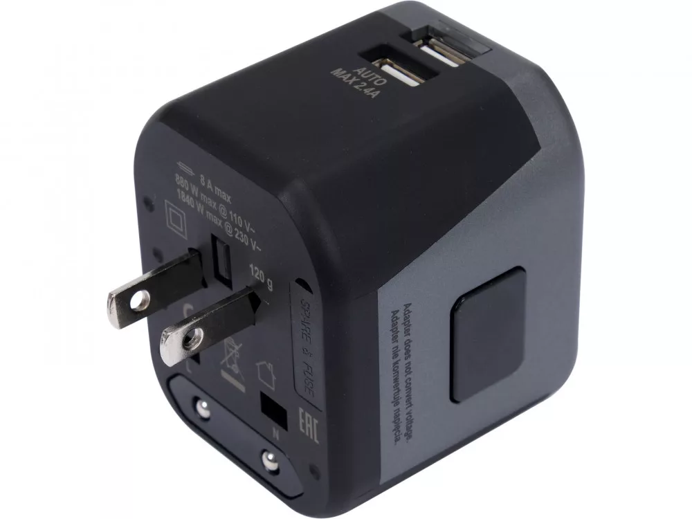 Adapter beépített töltővel és két USB porttal, több mint 150 ország szabványának megfelelő.