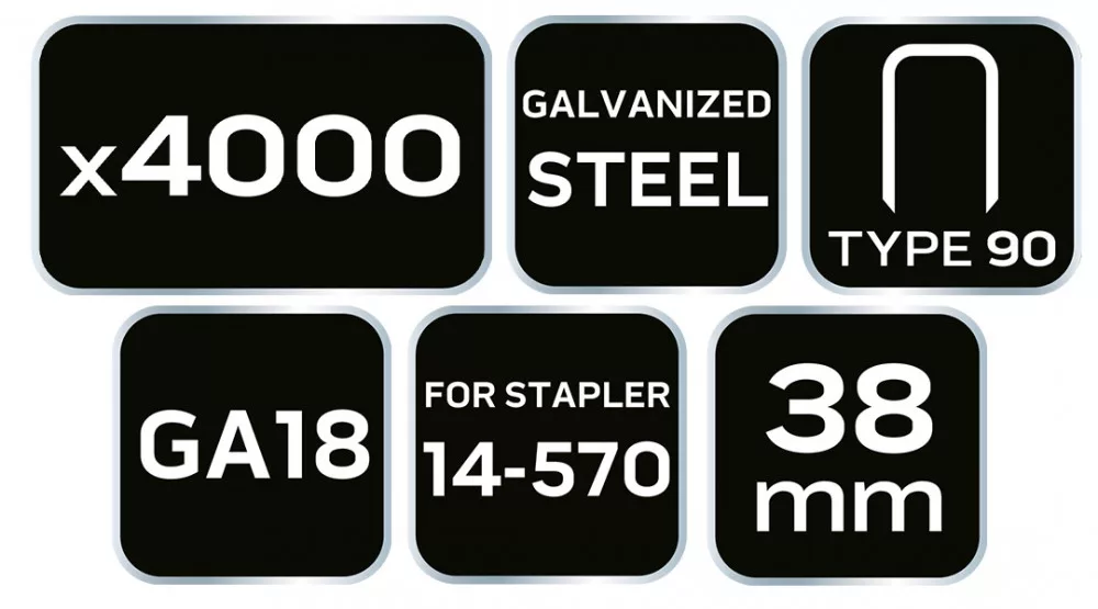 NEO Tűzőkapocs, horganyzott 90-es tipus, pneumatikus tűzőgéphez (14-570), GA18, 38 mm, 4000 db (14-630)