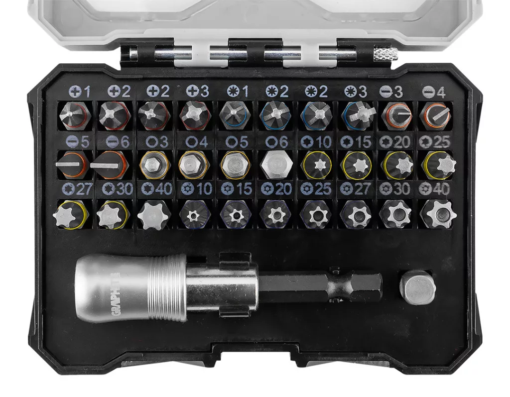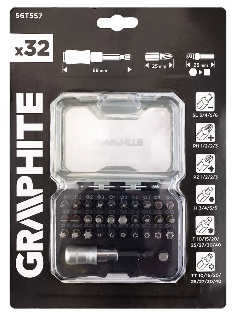 GRAPHITE Csavarhúzó bitkészlet 25mm, mágneses szárral műanyag tokban, 32db (56T557)