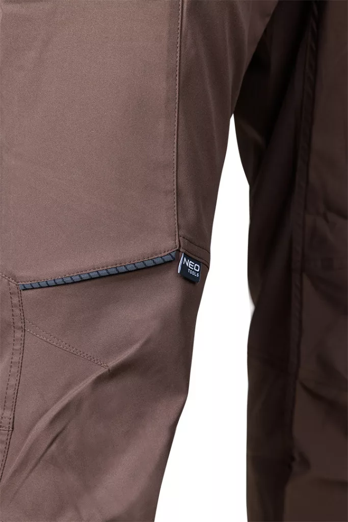 NEO 81-298-3 MUNKÁSNADRÁG, MIX&MATCH, SZTRECCS ANYAG, 135G/M2, BARNA. A Mix&Match sorozathoz tartozó, strapabíró nadrág, amely lehetővé teszi a munkaruhák tetszés szerinti összeállítását.Rugalmas és kényelmes viseletű, 100% poliészterből készült, 135 g/m2 súlyú sztreccs anyagból. Barna, univerzális színüknek köszönhetően számos feladatra alkalmasak. A fényvisszaverő betétek viszont modern megjelenést kölcsönöznek nekik, és növelik a sötétedés utáni használat biztonságát. A NEO TOOLS munkanadrágok további fényvisszaverő elemekkel rendelkeznek a profilozott térdeken. A névtábla lehetővé teszi a személyre szabást professzionális környezetben. A nadrág megfelel a CE EN ISO 13688:2013 szabványnak, és felbecsülhetetlen értéket képvisel a mindennapi használatban a szakemberek és a barkácsolás szerelmesei számára.
